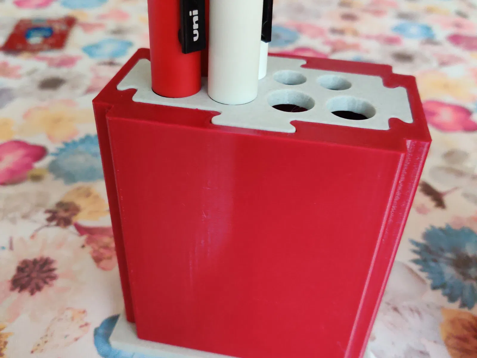 Cụ thể hơn, hộp này được thiết kế cho bút Posca, với kích thước PC-1 (lỗ nhỏ) và PC-3 (lỗ lớn). Các tệp được cung cấp phù hợp với bốn cái mỗi loại, nhưng vì thiết kế là định lượng, bạn có thể làm một cái phù hợp với bao nhiêu hoặc ít như bạn muốn.