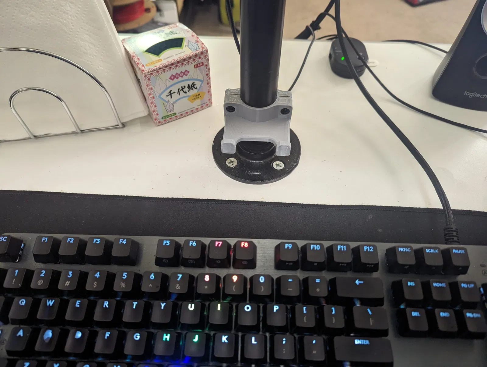 I made this to hold my keyboard out of the way for when I need my desk space. It connects to a standard 1" steel pipe (nipple) which I used in my modified monitor stand. it only works on vertical pipe.