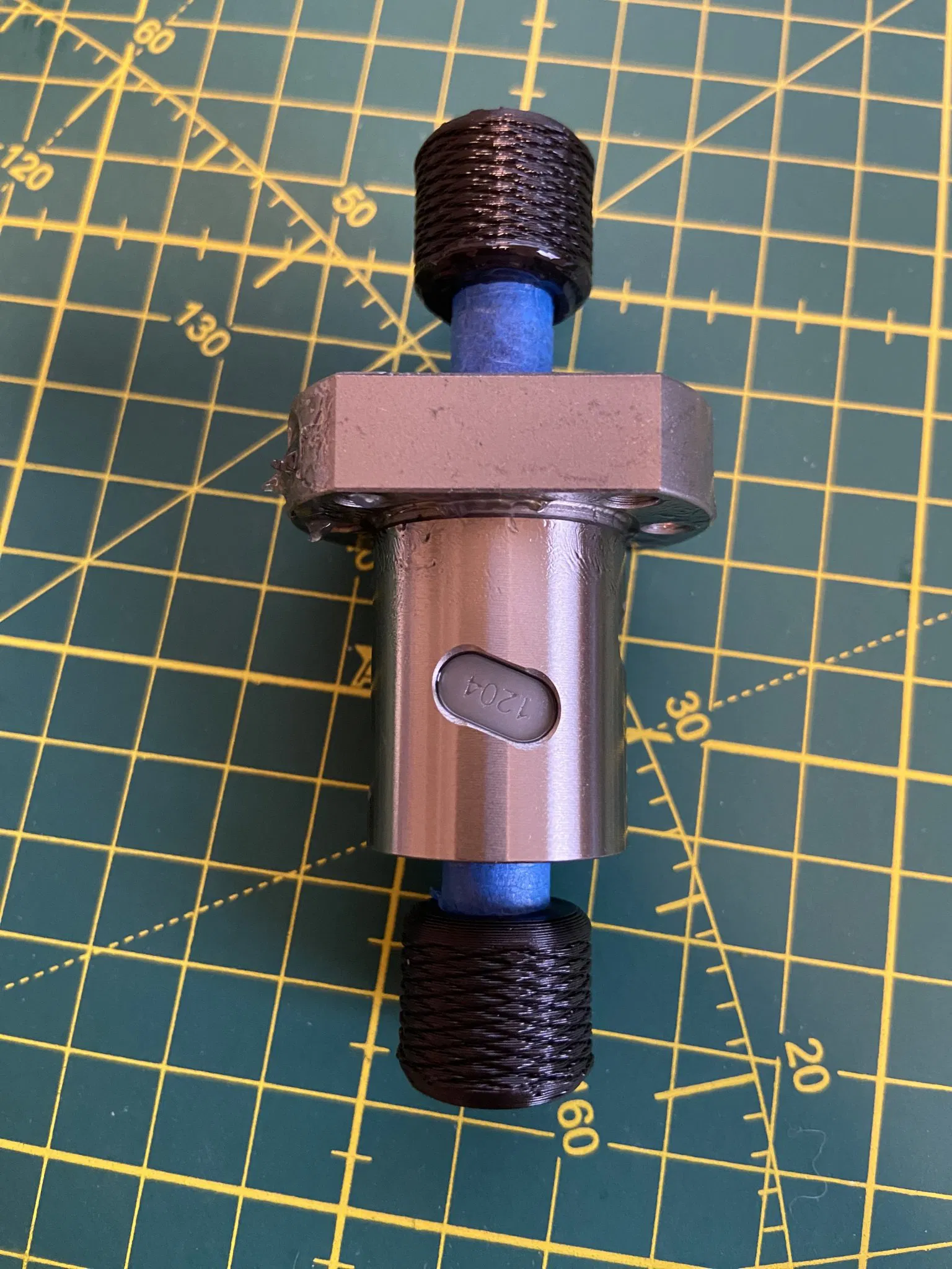 Wrap the nut retaining blank in painters tape. Then affix the retaining blank to the end of a 1204 ball screw and screw the nut onto the blank. Cap both ends of the blank with the blank caps.