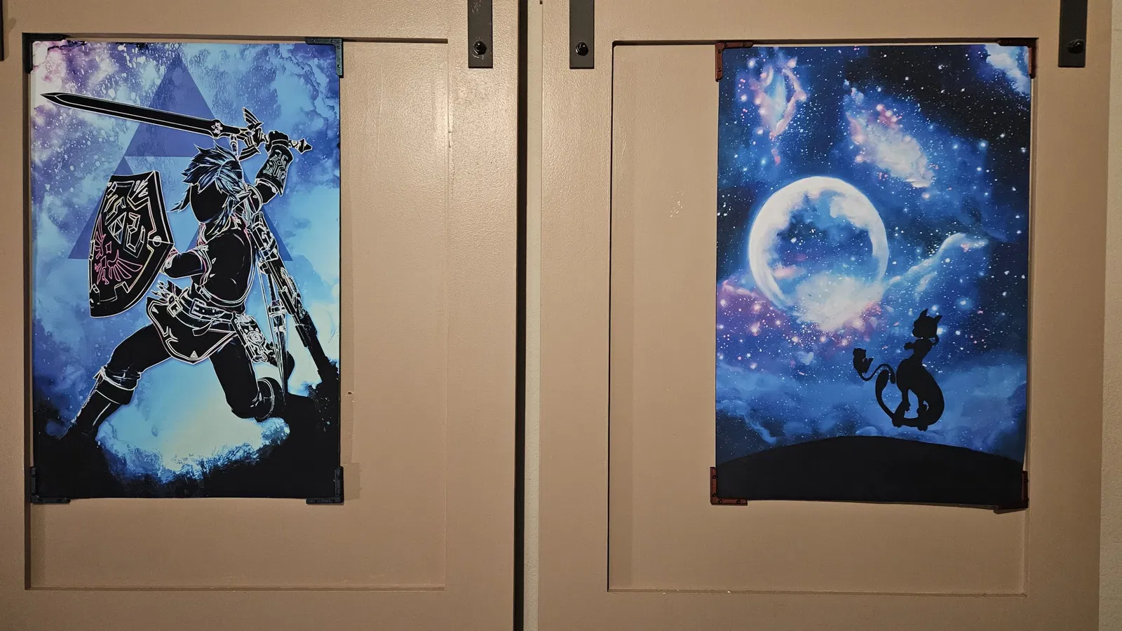 Khung góc cho poster có sẵn lỗ cắm ốc M3. Treo đồ mà không cần đục lỗ lên poster. Giải pháp đơn giản để trưng bày poster yêu thích mà không cần khung rườm rà, chỉ cần ốc M3 và băng keo hai mặt.