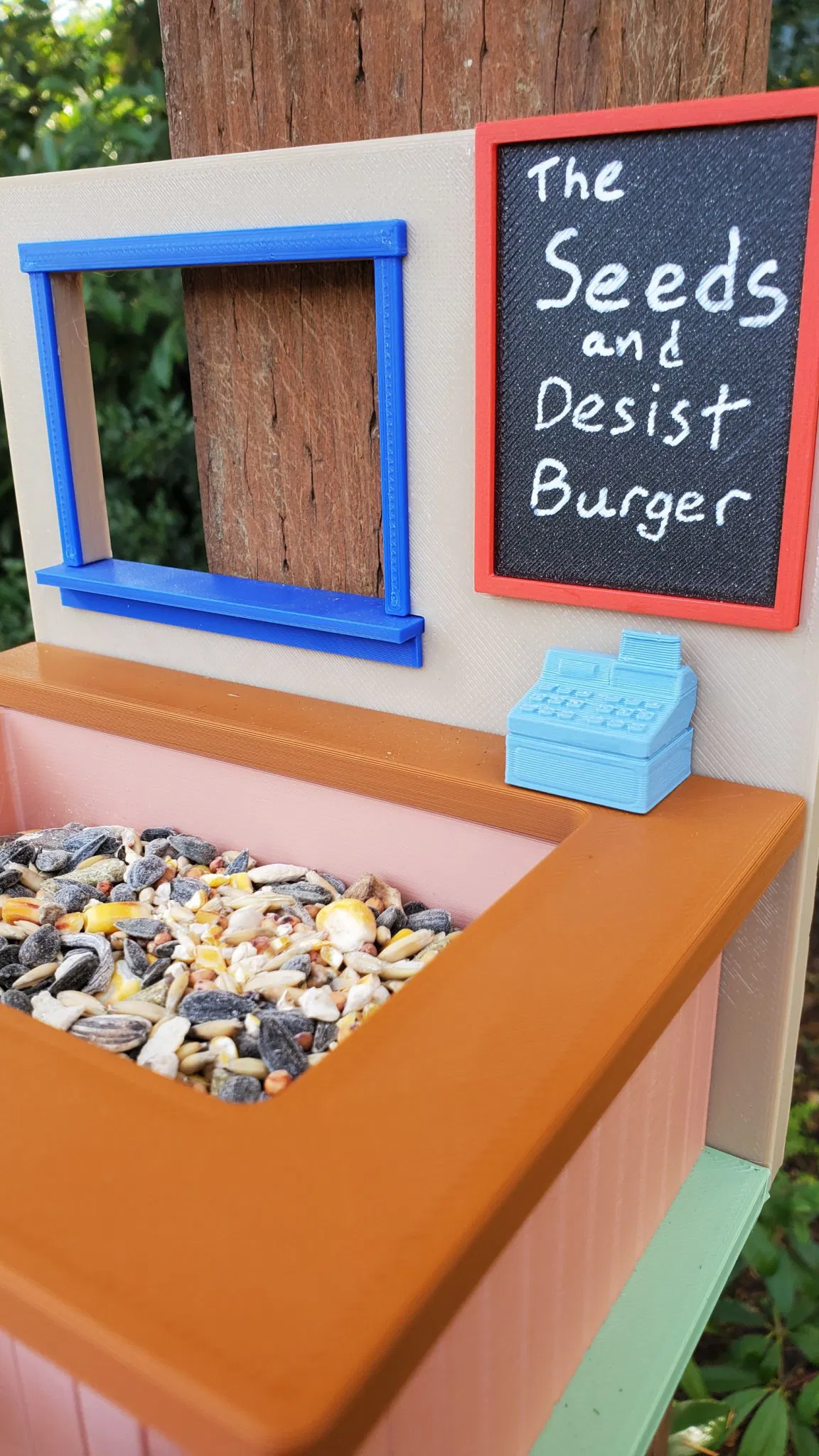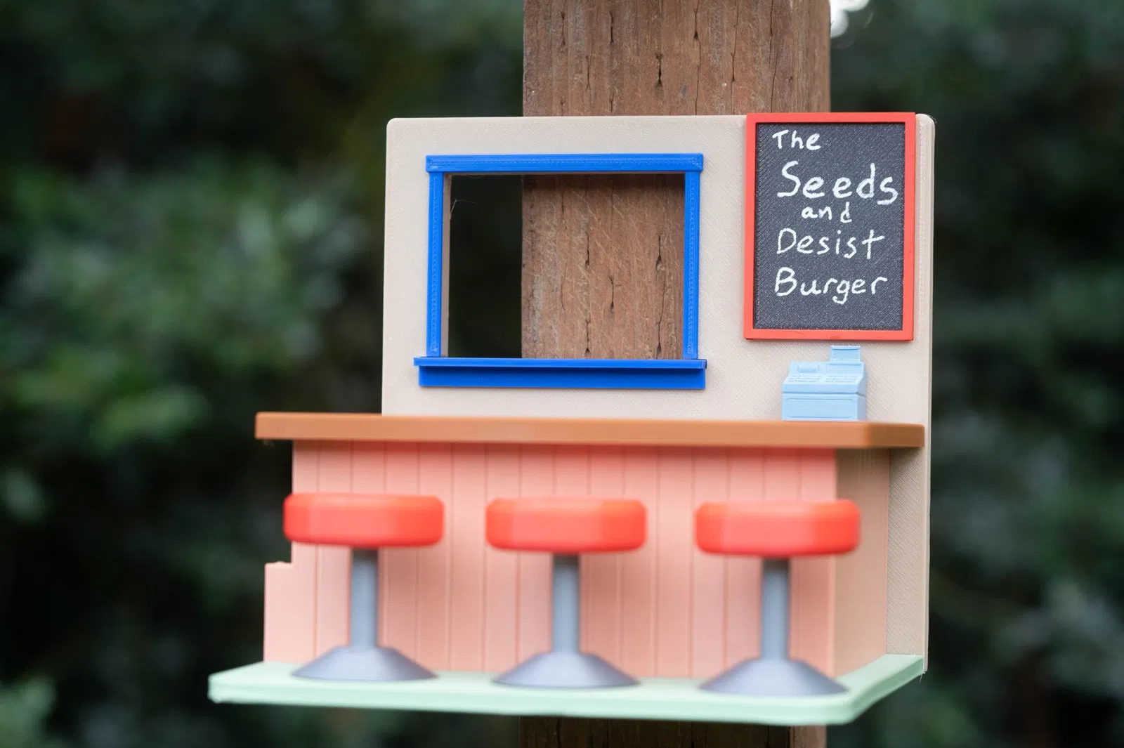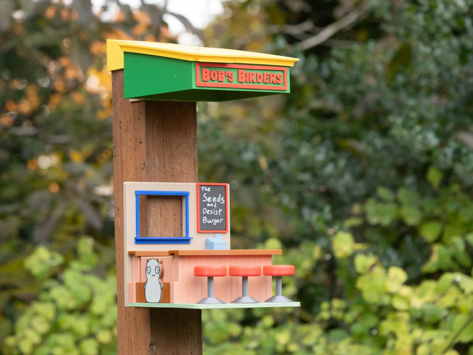 Một tiệm ăn burger cho các loài vật hoang dã trong sân nhà bạn. Chào mừng đến với Đại Lễ Khai Trương Lại Lần Lại Lần Lại Lần Lại! Máng ăn này được thiết kế để dễ in 3D, chịu được va đập, và mang đậm phong cách Bob's Burgers.