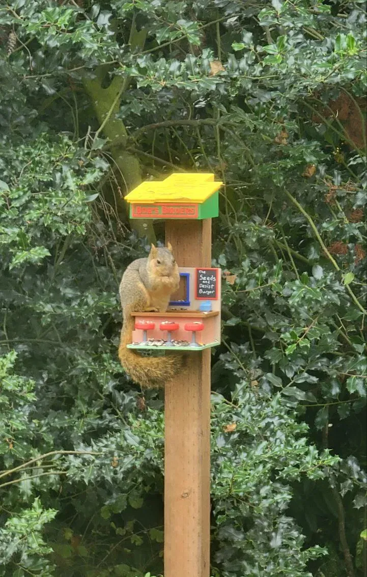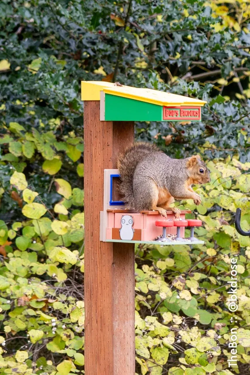 Cái này ra đời vì một hôm tui tưởng tượng Teddy trong Bob's Burgers thành con sóc, đang ngồi trên cái ghế đẩu của ổng ở tiệm ăn. Nhà tui có mấy cái máng ăn cho chim chim, mà nó cứ trêu mấy con quạ, chim giẻ cùi, với mấy con sóc to quá hổng vừa.