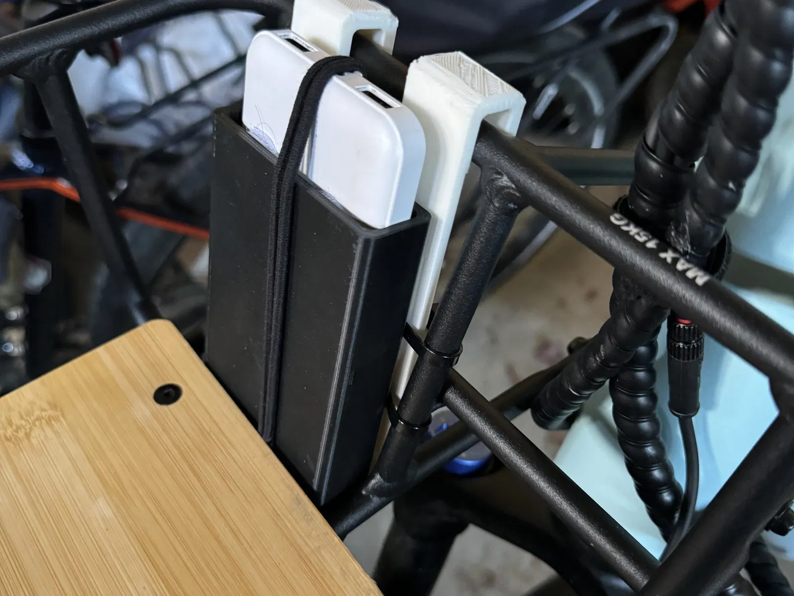 Giá đỡ sạc dự phòng hoặc pin cho điện thoại, dùng gắn trên rổ trước xe đạp điện Velotric Packer 1 để cung cấp nguồn cho iPhone.