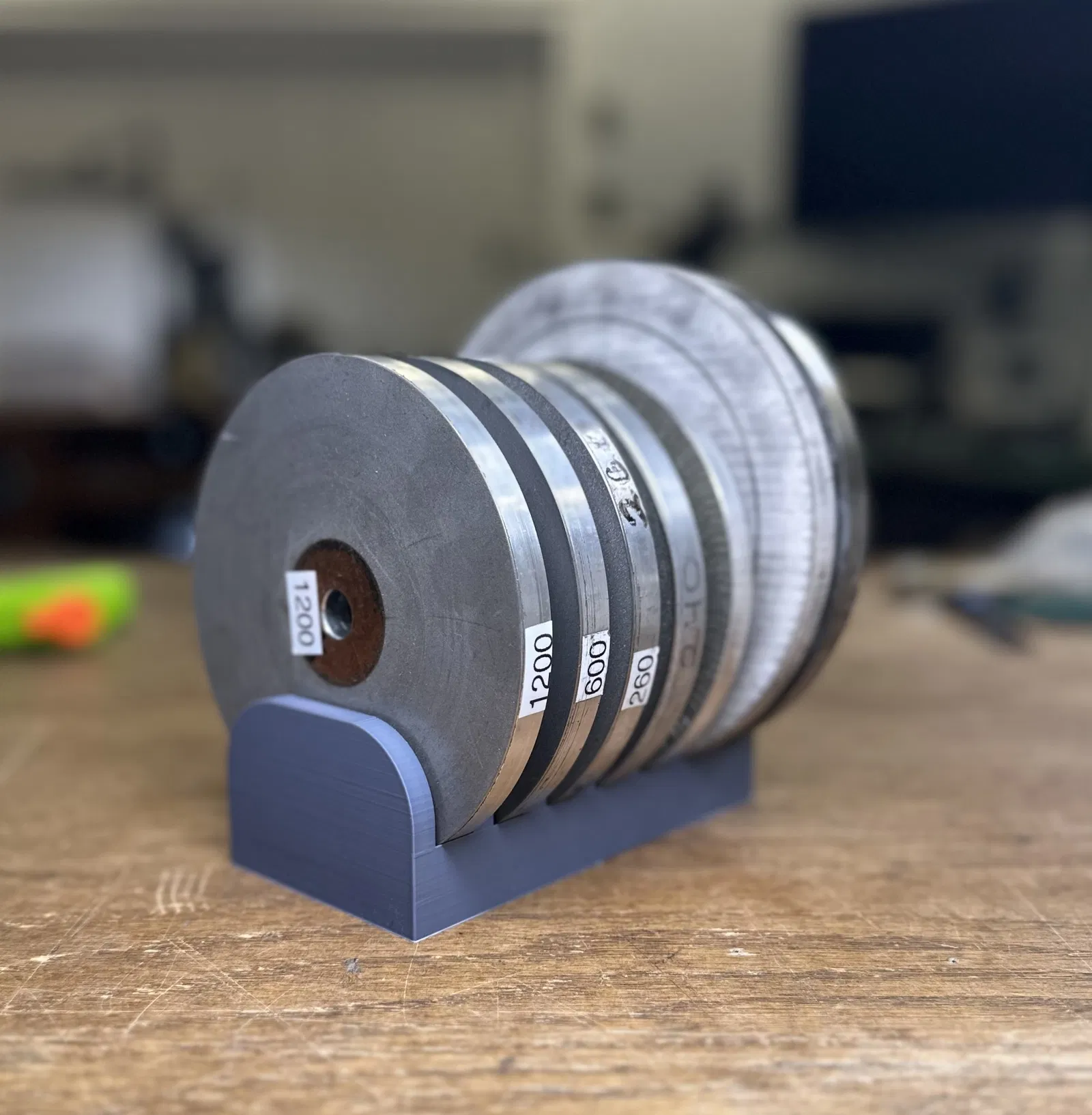 Giá đỡ bánh xe tiện dụng cho thợ khắc hoặc bất kỳ ai sử dụng đá mài kim cương 5" nha. Đáy cong giữ đá mài chắc chắn.