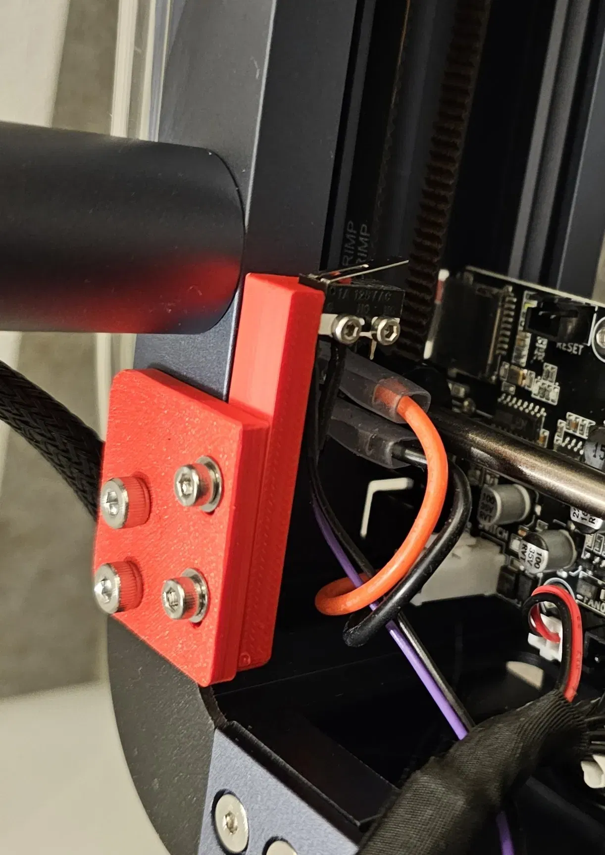 Để lắp trên trục Y: tháo 2 ốc của khung máy phía dưới nút bật nguồn. Thay thế bằng tấm đế và cố định bằng hai ốc M4x12. Gắn microswitch vào bộ phận hình chữ L và gắn bộ phận này vào tấm đế.