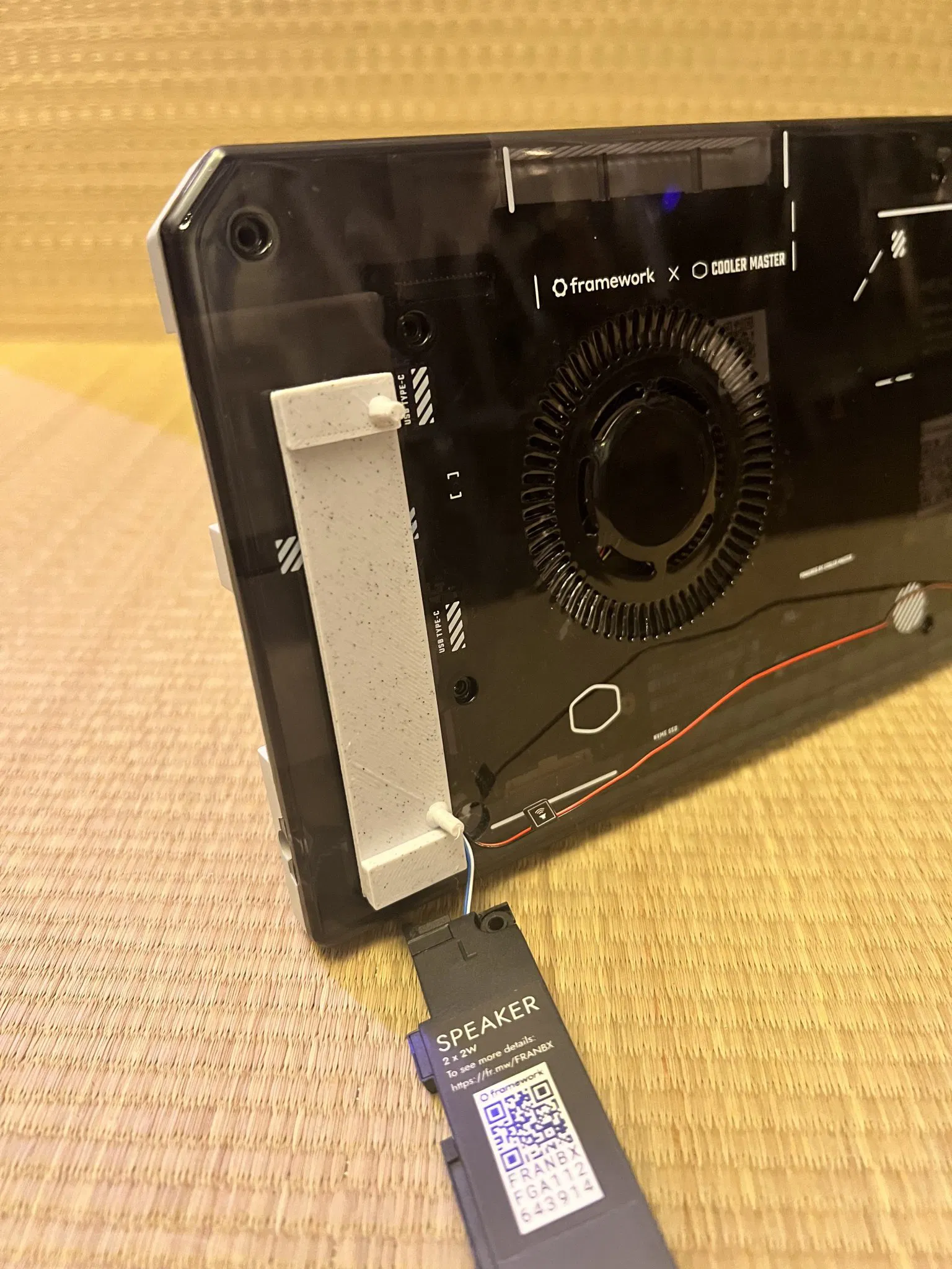 Một đế để gắn loa Framework lên bề mặt. Tận dụng các lỗ có sẵn trên loa để giảm rung động. Gắn đế bằng các miếng dán xốp để giảm rung động thêm một chút.