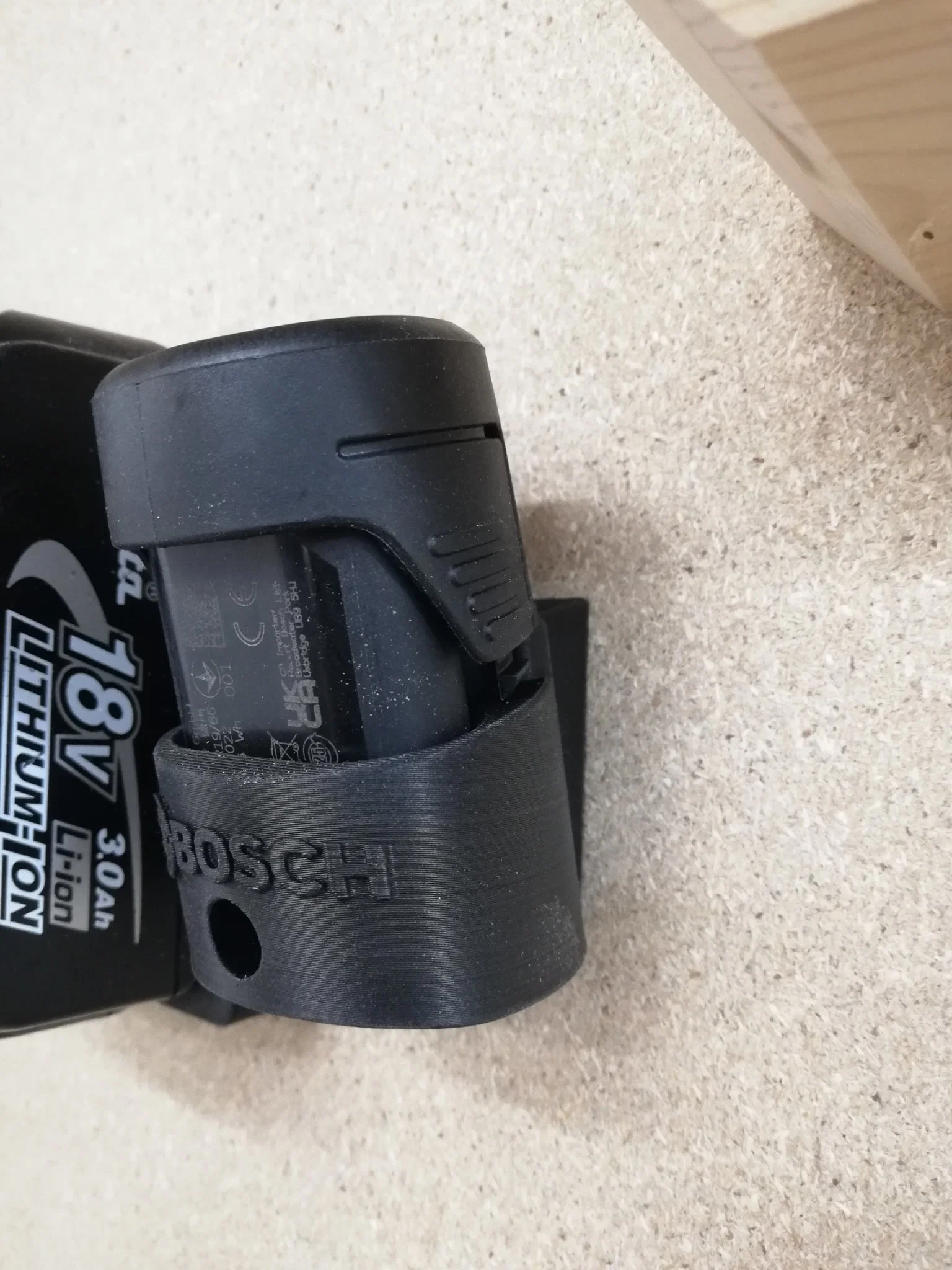 Tao không tìm thấy cái giá treo tường nào cho pin của Bosch GSR 12V, nên tao đã tự làm một cái. Nó có thể được cố định vào tường bằng hai con vít dài 40mm. Cái đế giữ hơi nghiêng để tiện sử dụng.