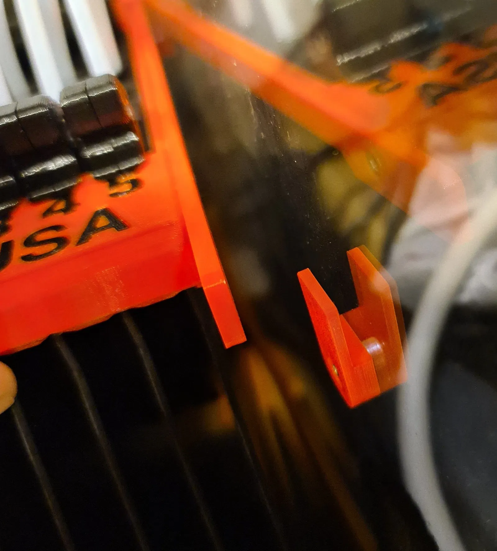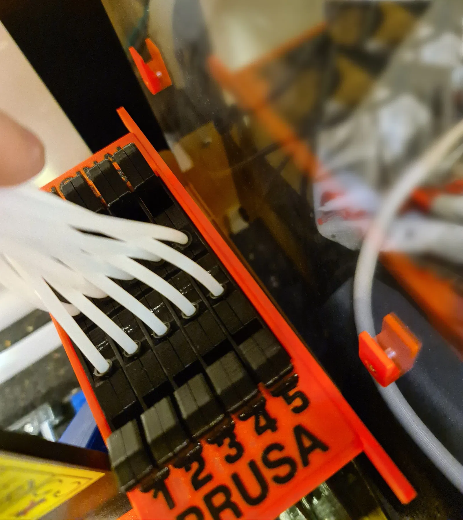 Đây là một cách để treo bộ đệm MMU3. Tôi đã dán thanh nối vào bộ phận phân đoạn. Các móc nhỏ được vặn vào tường với khoảng cách phù hợp và bạn có thể treo bộ đệm vào đó.