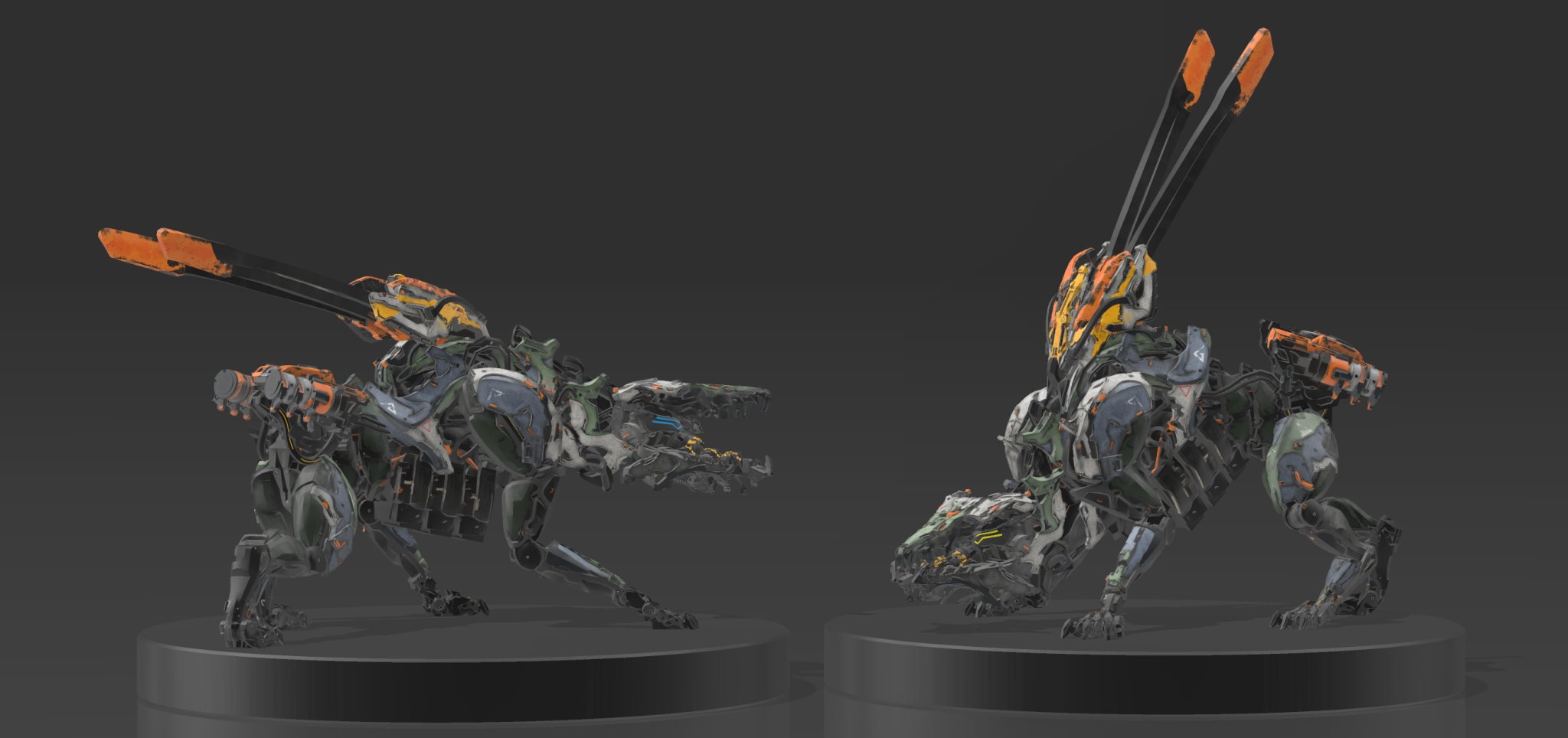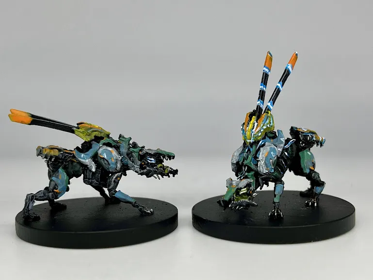 Scroungers call in reinforcements to take down careless hunters. Two poses are available, one stalking its prey and the other sending out an alert. These machines are to scale with the official board game and stand on 40mm bases. It is intended to be printed in one piece (with the base) for stability. All credit for character design goes to Guerrilla Games.