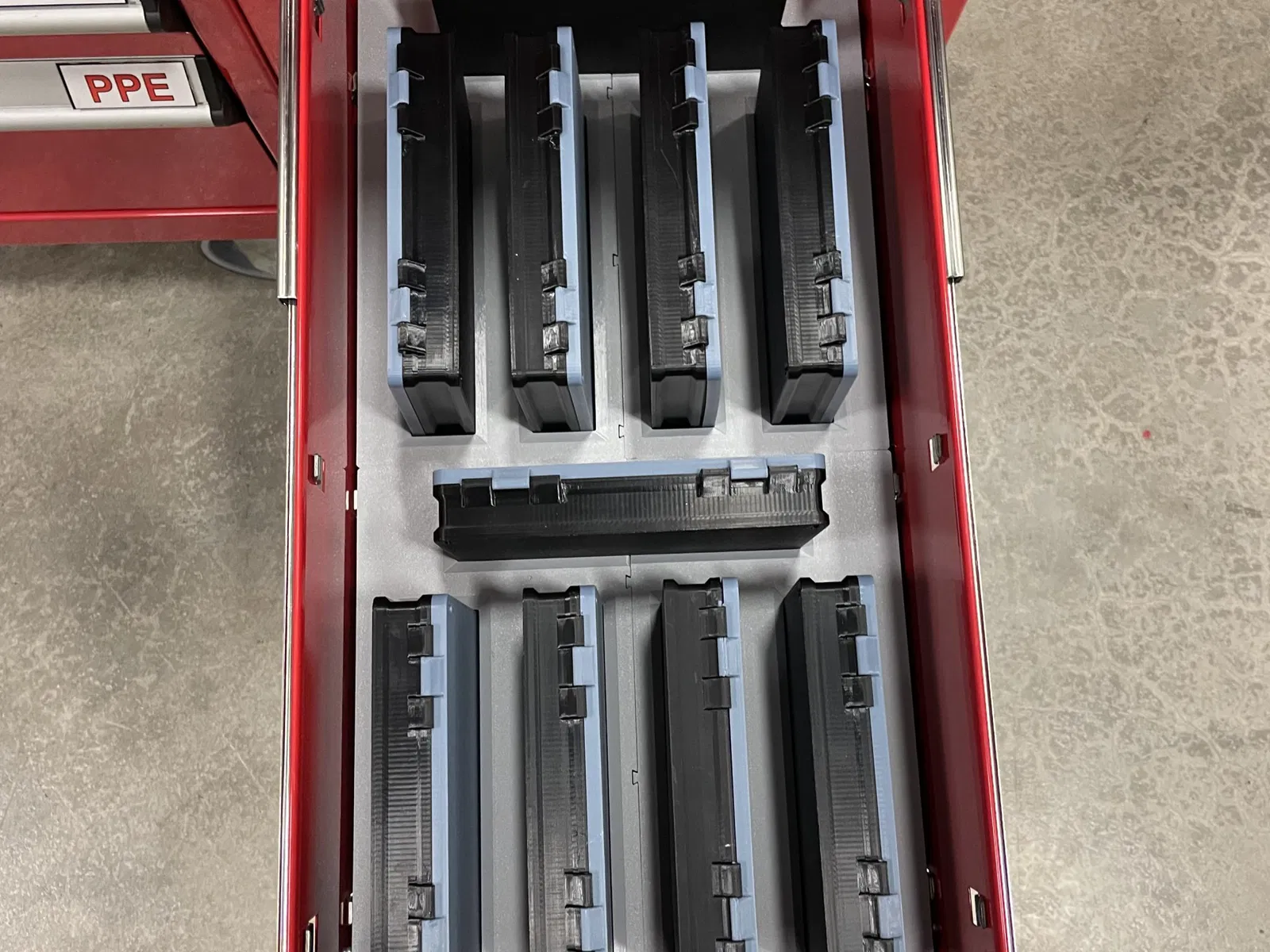 Đợt đó tui muốn có cách để dựng đứng mấy cái hộp này trong cái hộp hông của Harbor Freight á, để khỏi phải rút cả chồng hộp ra khi cái mình cần á thì lại nằm ở dưới cùng. Nên tui mới làm ra cái khay/cái gá này.
