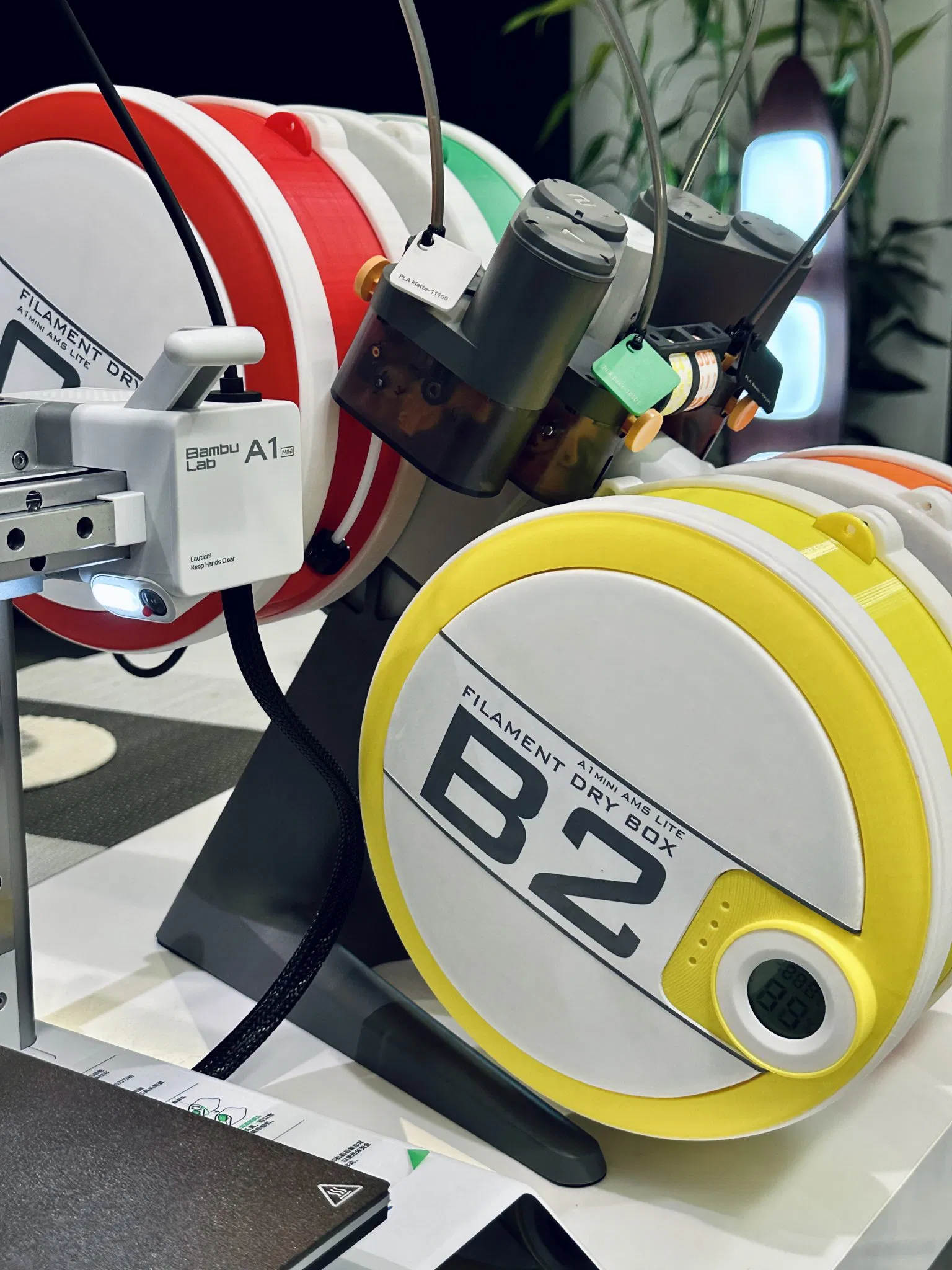 Hướng dẫn lắp đặt hộp sấy sợi cho máy in 3D A1mini với bộ AMS Lite. Cần 4 ốc M3 và 4 ốc M3, lưu ý bạn cần ốc dự phòng từ máy X1CC hoặc P1SC. Máy A1mini không thể tự in được. Xem video hướng dẫn trên Bilibili hoặc Douyin với từ khóa "嘟吉".