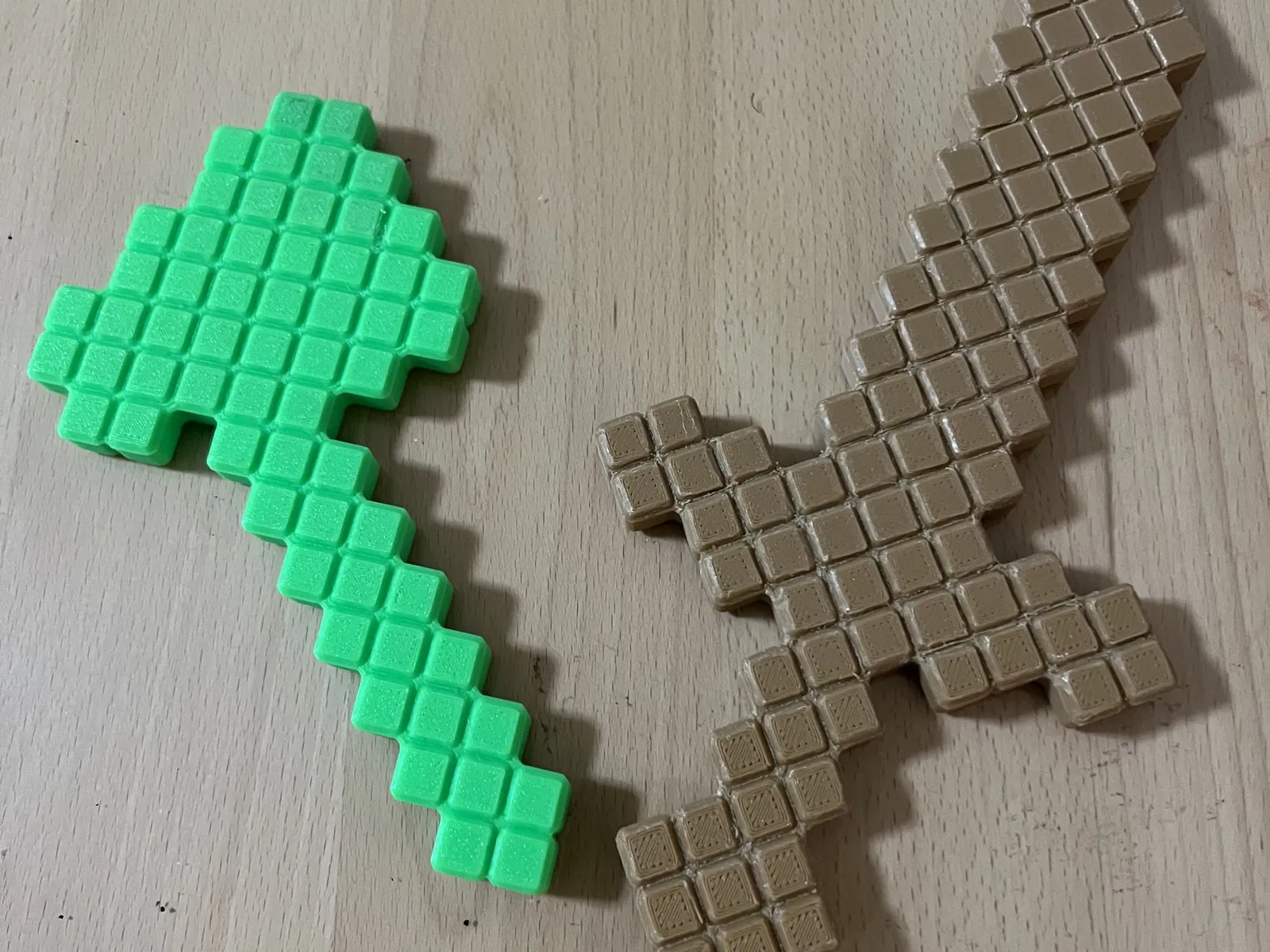 Mấy món đồ Minecraft cơ bản (rìu, kiếm, xẻng, cuốc, mai/búa) với các phiên bản pixel. Mỗi pixel là 10mm, giúp bạn dễ dàng tùy chỉnh kích thước.