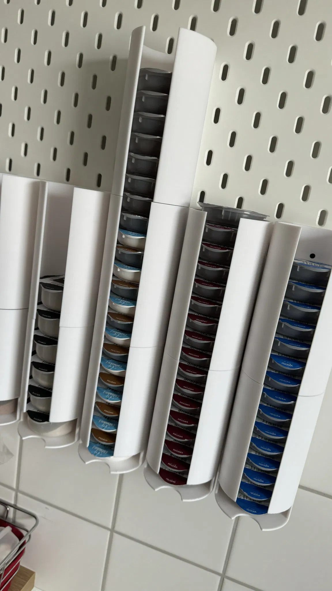 Bộ Tassimo Skadis Dispenser đơn giản với hệ thống gắn T-Nuts, có hai phiên bản chiều cao đĩa 18mm và 30mm, cùng các phần mở rộng tùy chọn. Lý tưởng để treo trên bảng Skadis của IKEA.