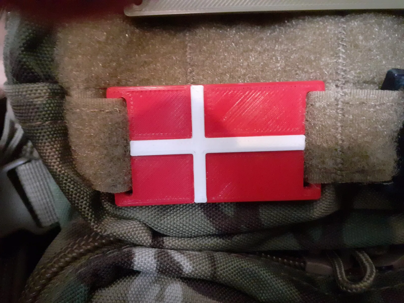 Một lá cờ Đan Mạch có gắn mount Molle, thích hợp cho các hoạt động như airsoft. File in 3D sẵn sàng với thông số Infill 40% cho máy Creality-SE6. Không cần Rafts hay Supports.