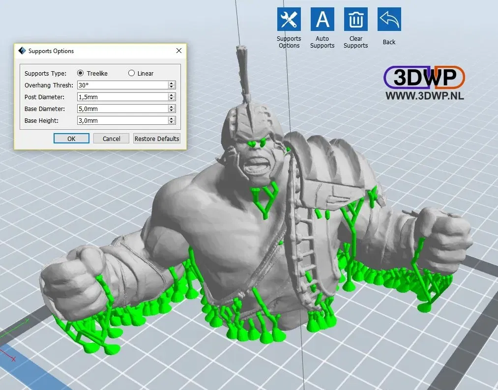 Đây là phiên bản remix của mô hình Hulk Ragnarok tuyệt vời bởi Masterclip, mô hình đã được tái cấu trúc hoàn toàn và điêu khắc mịn màng và có một đế phẳng. Tôi cũng đã thêm một phiên bản cầm búa, búa được tạo ra bởi Killonious. Và tôi đã thêm mô hình đầu tiên với các trụ hỗ trợ, nó được tạo ra bằng FlashPrint. Bằng cách này, bạn có thể cắt mà không cần hỗ trợ và dễ dàng loại bỏ các trụ sau khi in.