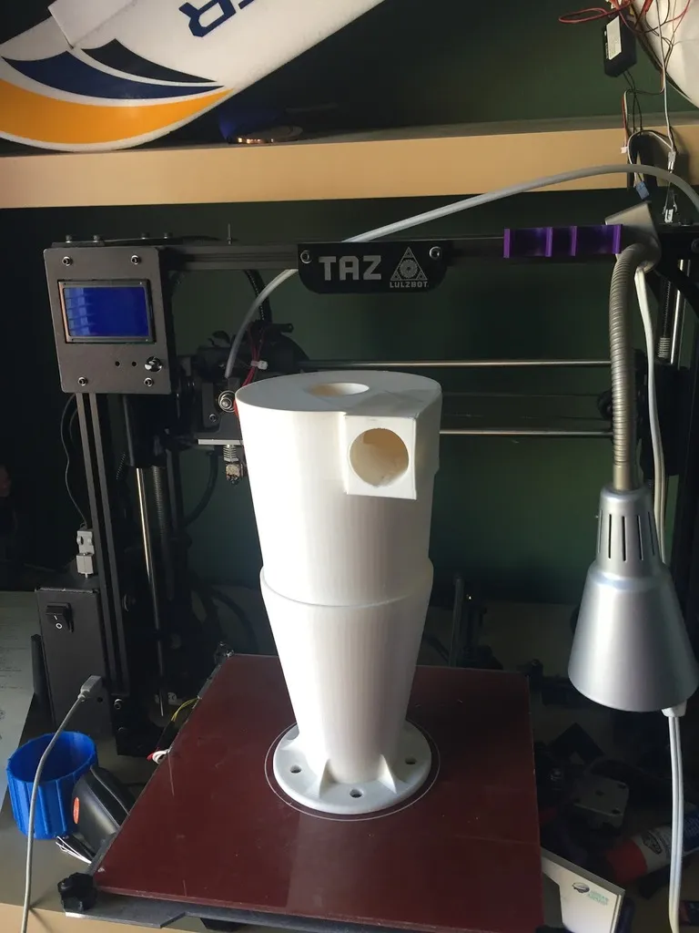 Đây là một bộ tách lốc xoáy cho máy hút bụi khô ướt. Mình khuyên bạn nên in với chiều cao lớp 0.3mm và ít nhất 3 lớp vỏ. Không nên in lớp mỏng hơn. Các bức tường trên bản in này có lẽ dày hơn đáng kể so với mức cần thiết, nhưng thành phẩm khá chắc chắn. Mình đã dùng hơn 1.5kg sợi nhựa và khoảng 24 giờ để in trên máy Lulzbot của mình.