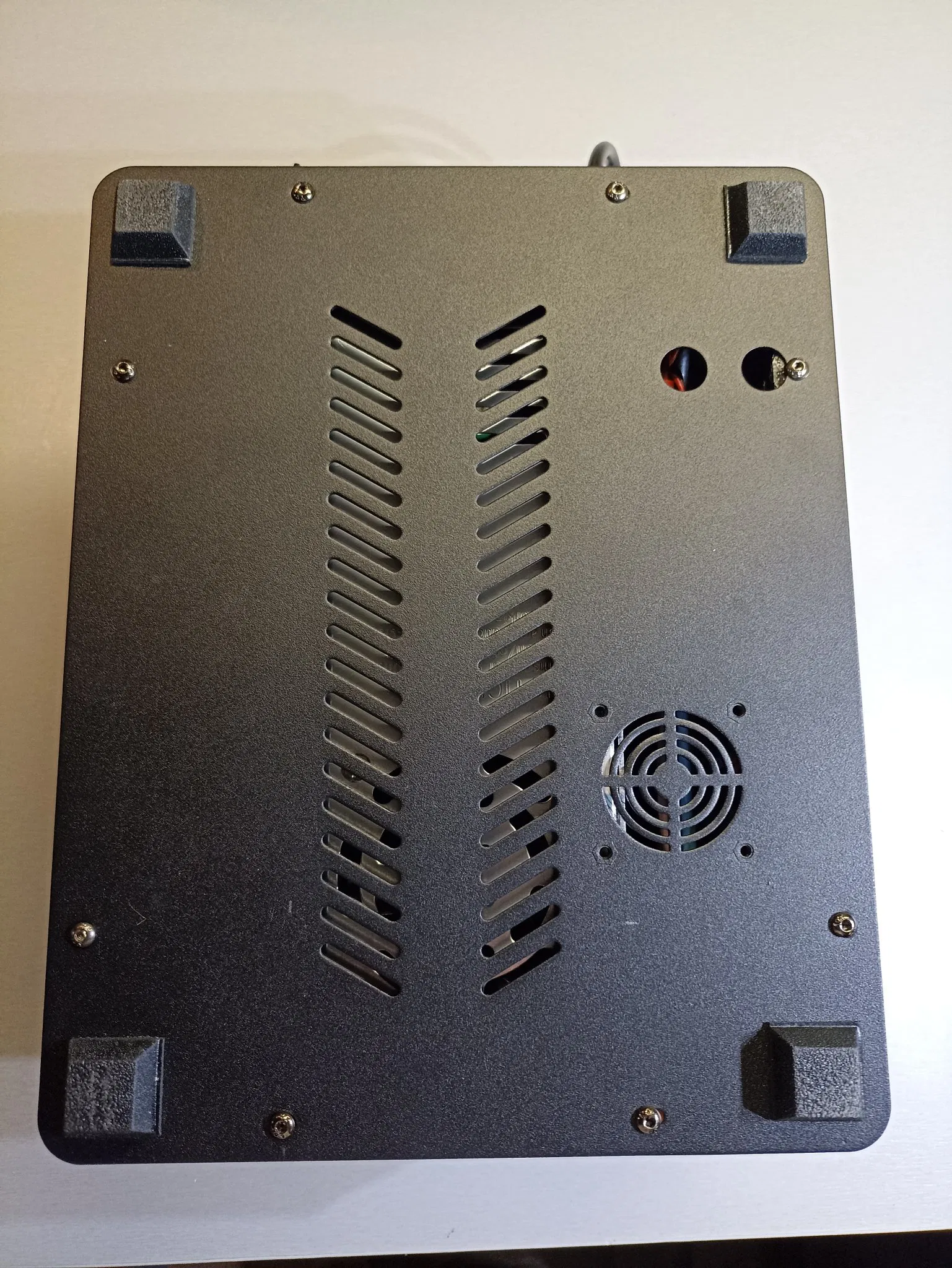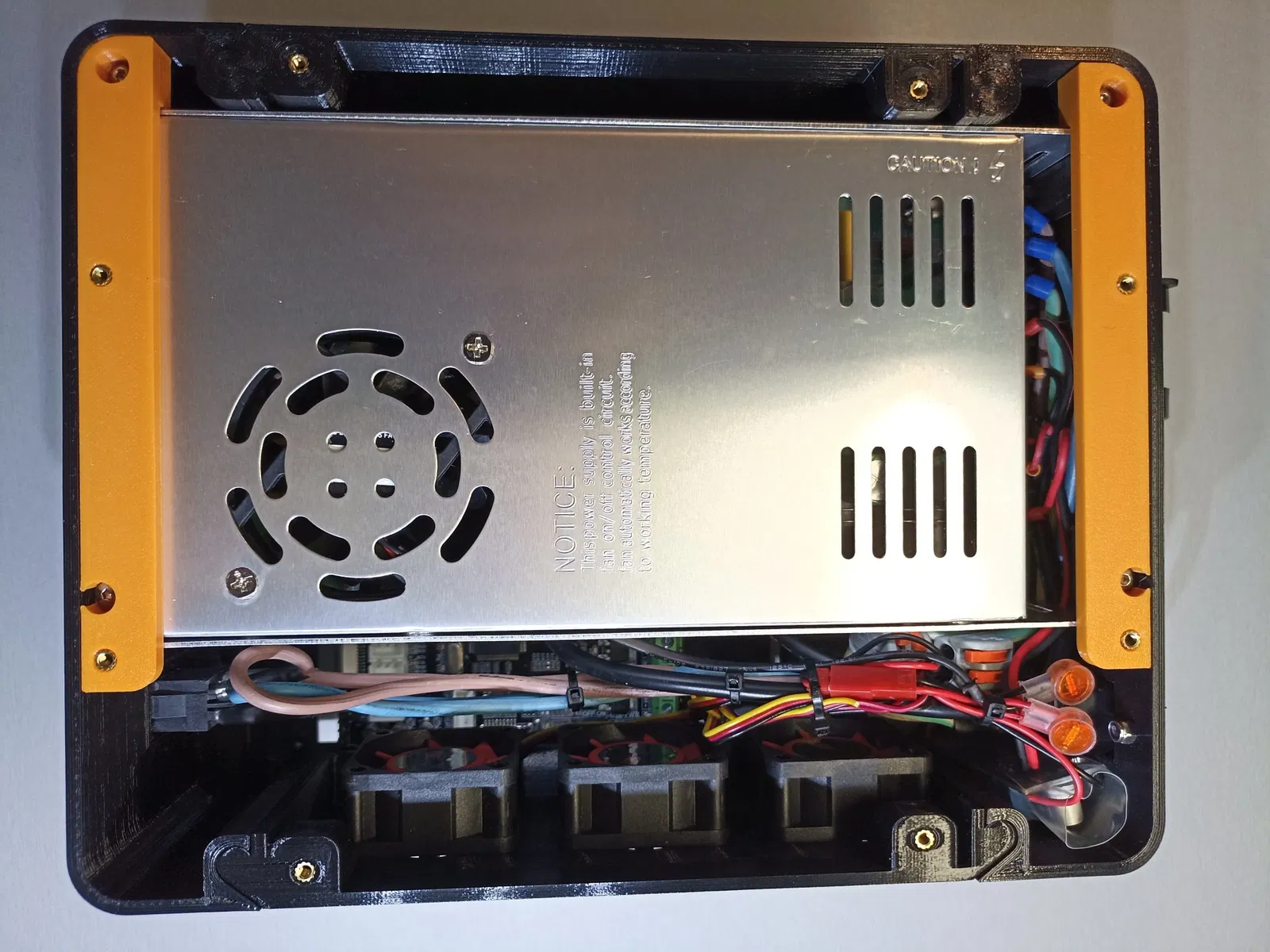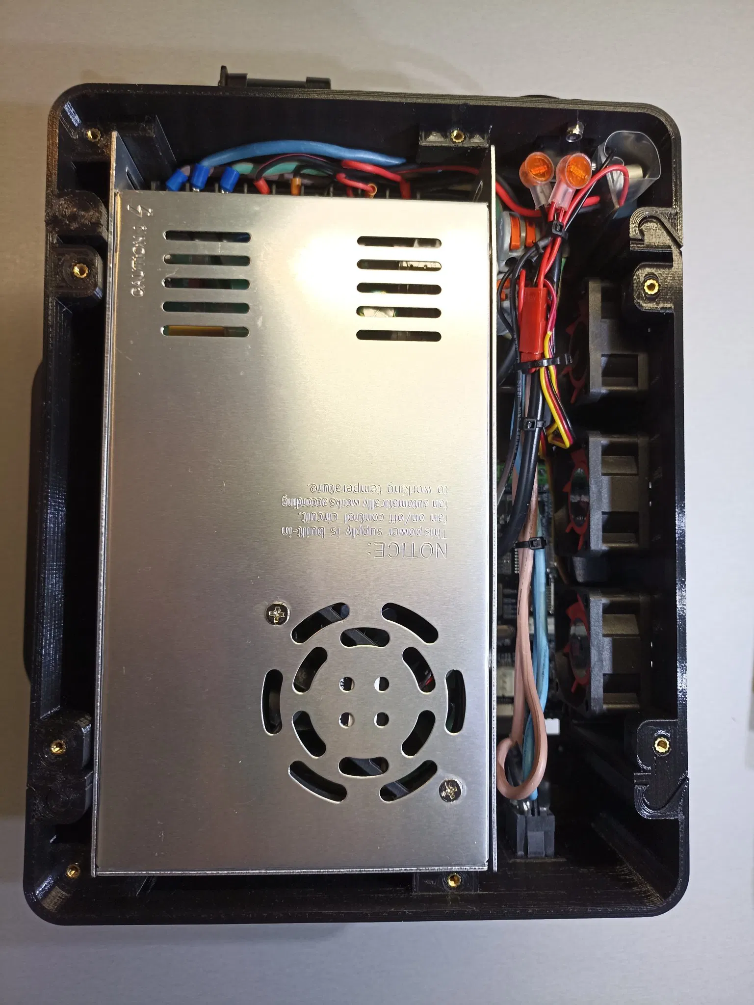 Cái này để gom gọn máy in và nguồn lại với nhau. Mình có dùng 3 cái quạt 4020 /12v, mình đấu nối chung với quạt của bộ nguồn. 12V là đủ xài rồi mà gần như không nghe tiếng luôn, ba cái quạt 4020 này làm nhiệm vụ làm mát chính. Công tắc thì mình xài lại cái zin.