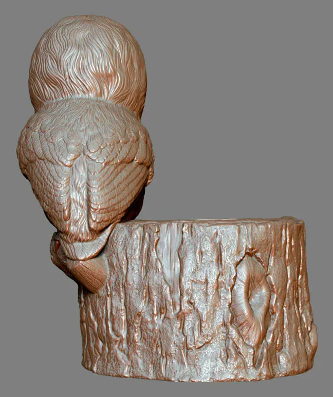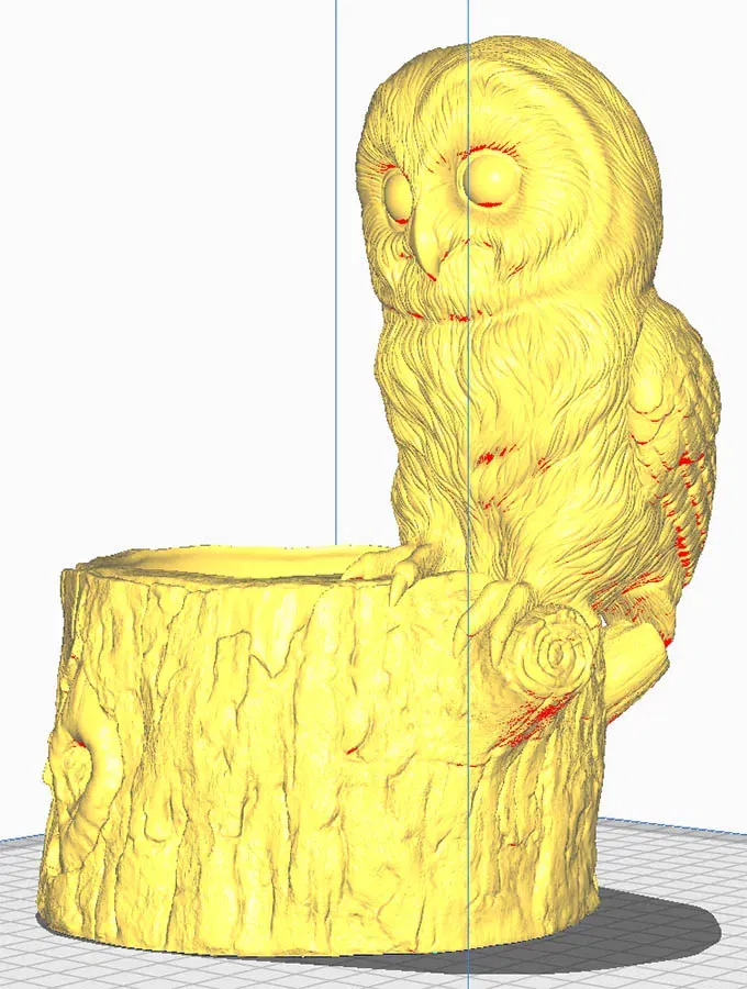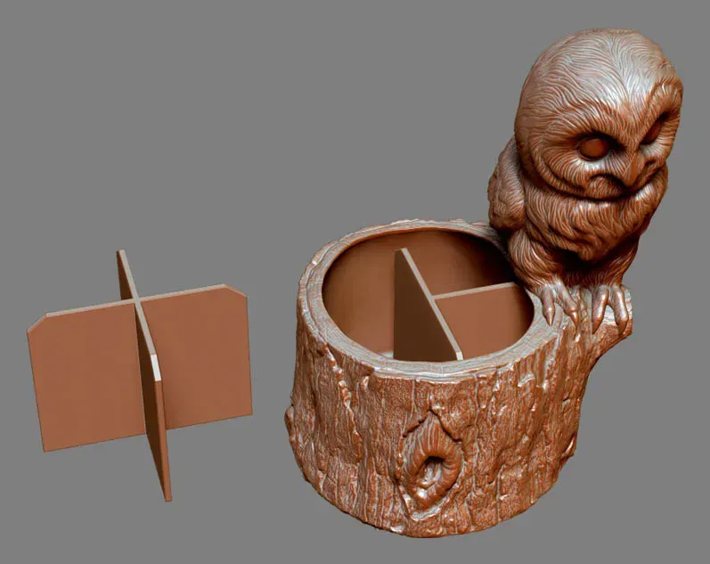 An owl themed planter/organizer/item holder. No support required to print, and no print related post-processing/cleanup required after the print. Looks really cute/realistic when painted. Will be an eye catcher after, I guarantee it. To use as an item holder, print one of the included dividers and put it into the wood log. Or you can go creative and design your own divider, check the readme file (readme.pdf) for that.