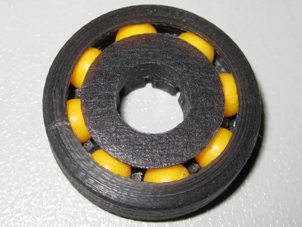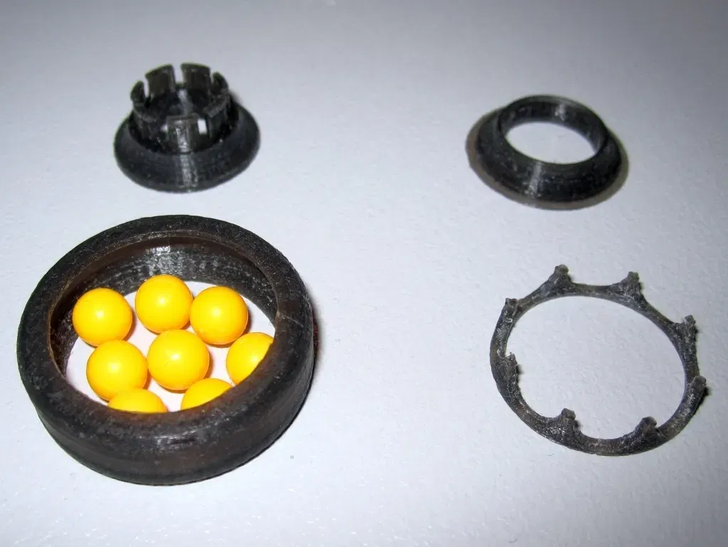 Một ổ bi thực sự cần một lồng để tách các bi. Vì vậy, tôi đã thay đổi ổ bi đầu tiên của mình ( https://www.f3d.vn/3d-model/677-vong-bi-bong-lan-thiet-ke-lap-ghep-khong-can-keo ) thành 8 bi và thêm một lồng. Tôi hơi ngạc nhiên rằng lồng thực sự cải thiện chức năng của ổ bi. Bạn có thể thấy sự khác biệt trong video này: http://www.youtube.com/watch?v=CCsoIQ4pXQ4 Nếu bạn muốn in ổ bi này, bạn sẽ cần một máy in được hiệu chỉnh tốt. Sử dụng độ cao lớp là 0.1mm. Sau khi in tất cả các bộ phận (và đặc biệt là lồng) phải được mài nhẵn hoàn hảo. ### Hướng dẫn - In các bộ phận (lật inner_c_2.stl và cage.stl)