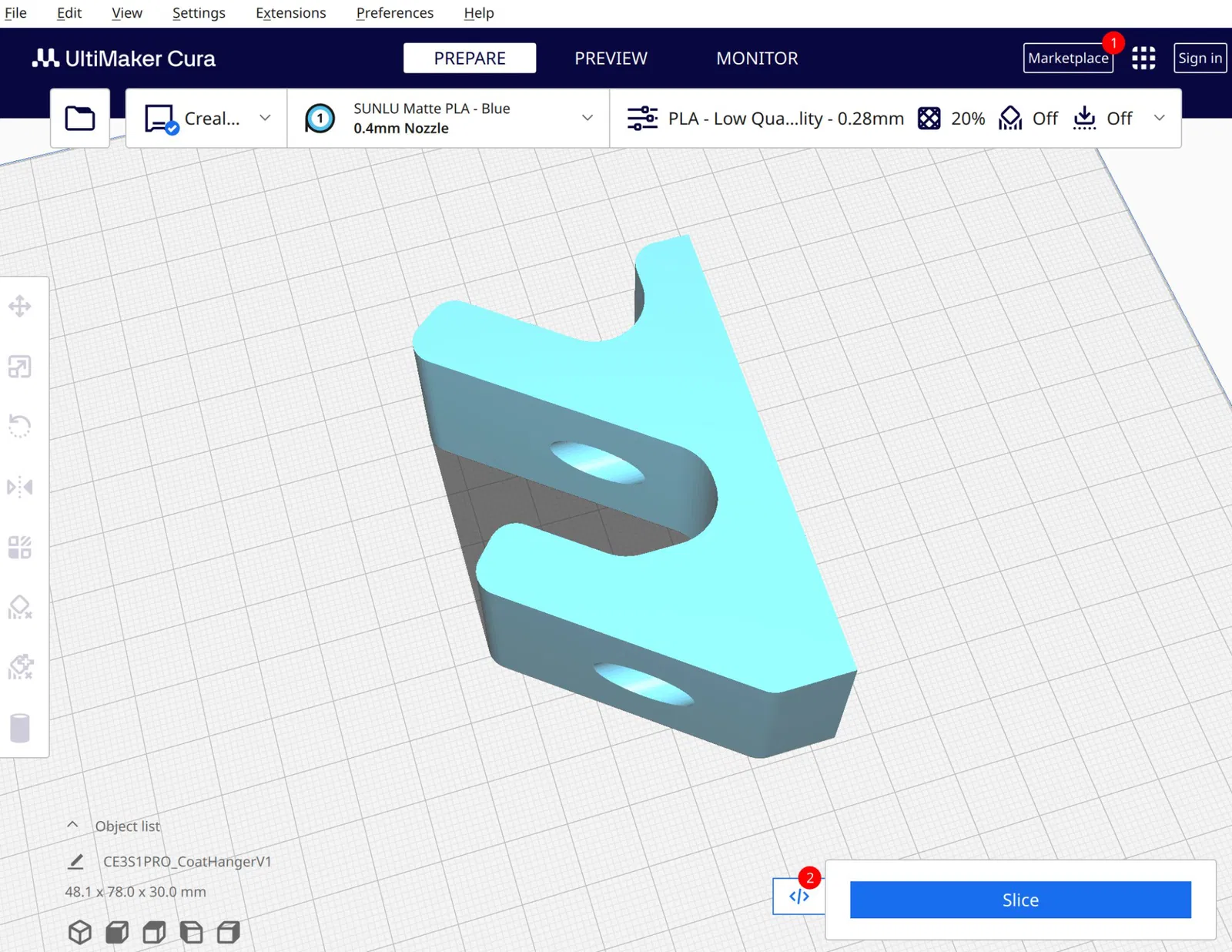 Mình đã in bằng cài đặt PLA tiêu chuẩn. Khuyến khích in nghiêng với 4 hoặc nhiều hơn các lớp tường và 20% vật liệu độn bên trong.