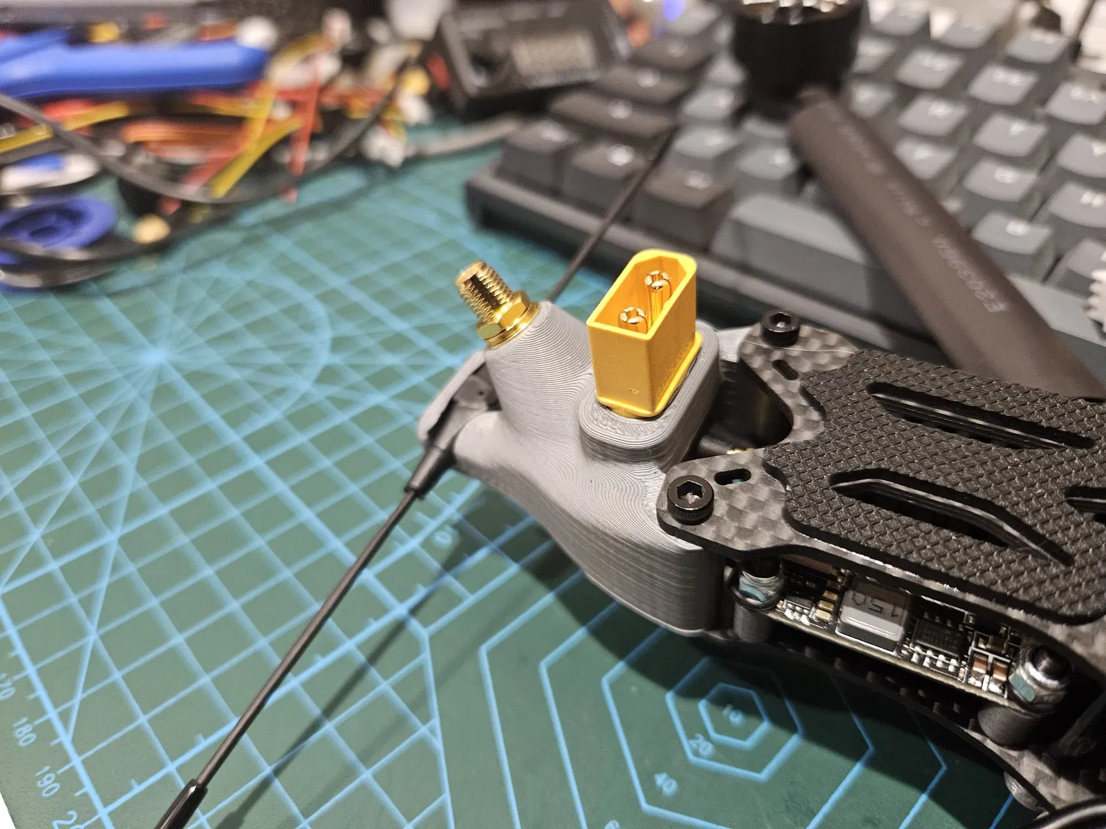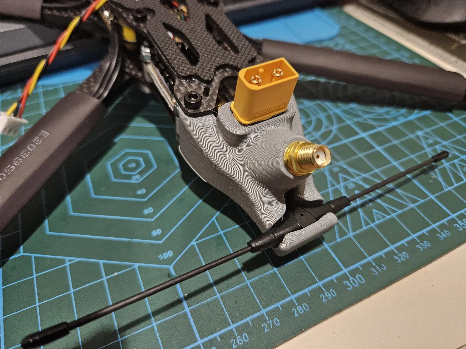 Giá đỡ phía sau cho ăng-ten radio và video cộng với XT60. In không cần hỗ trợ. Món đồ này là một bộ phận tùy chỉnh cho drone FPV, được thiết kế để gắn ăng-ten radio và video cũng như đầu nối XT60 ở phía sau khung APEX HD 8 inch.