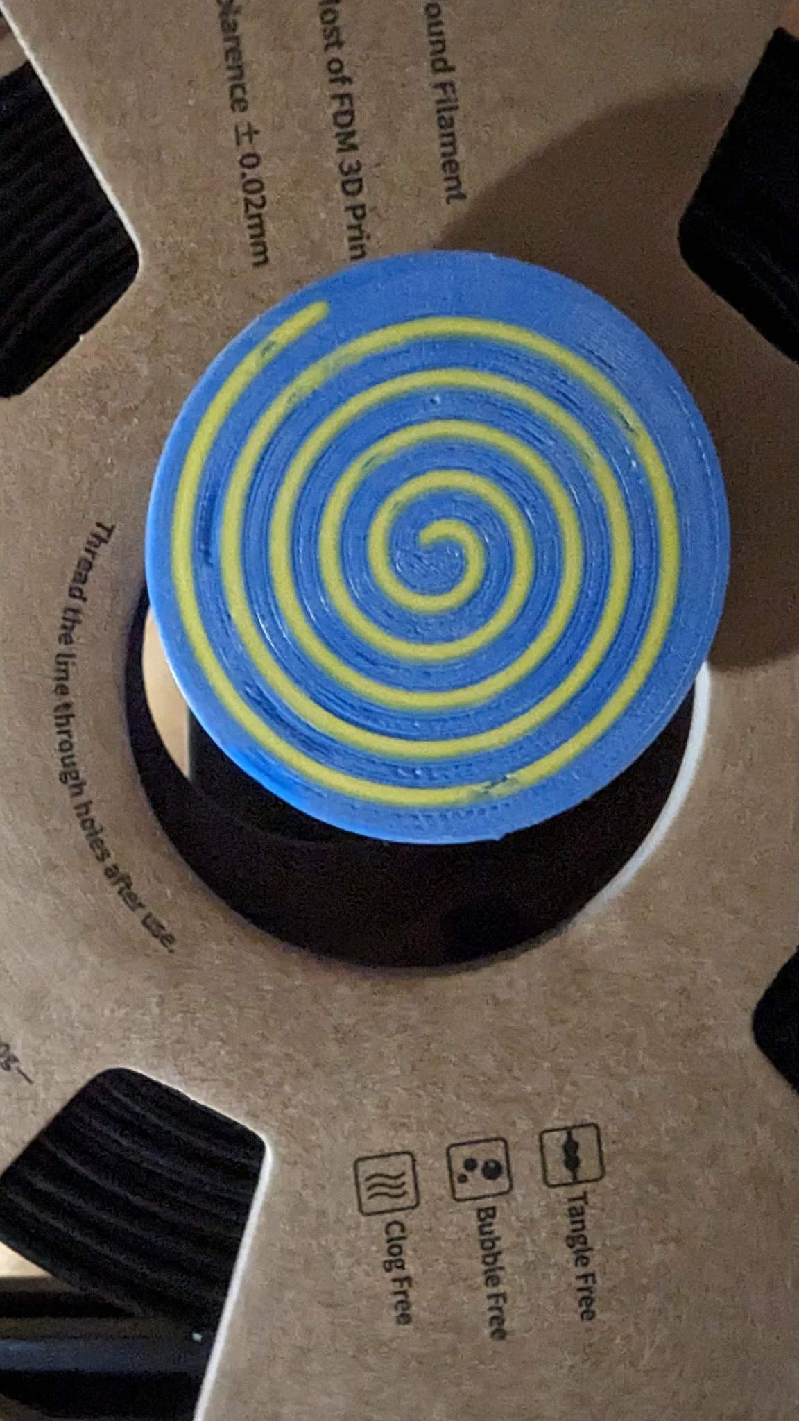 Phần phía trước được vặn vào và đồng thời cố định vòng bi. Vòng bi phía sau là vòng bi tự do. Cuộn dây được in hai màu ở phía trước, rất phù hợp với máy in IDEX. Đây là lần đầu tiên tui in hai màu, chưa được tối ưu lắm.
