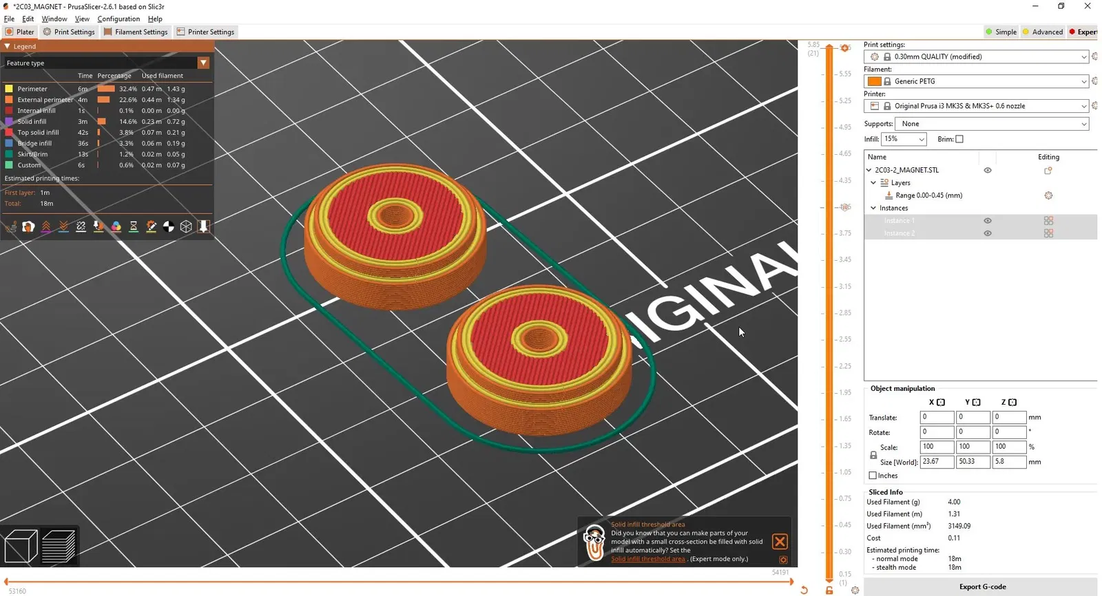 In ấn | Tui in bằng PETG, loại này thấy nó chịu IPA cũng tốt lắm. Tùy loại nhựa bạn xài mà có thể khác nha. Bạn in mấy lớp đáy mỏng lại để nó dính chặt vô cái bề mặt chỗ nam châm tiếp xúc á. Tui xài đầu phun 0.6mm nên in 3 lớp đáy dày 0.15mm, còn lại là 0.4mm.