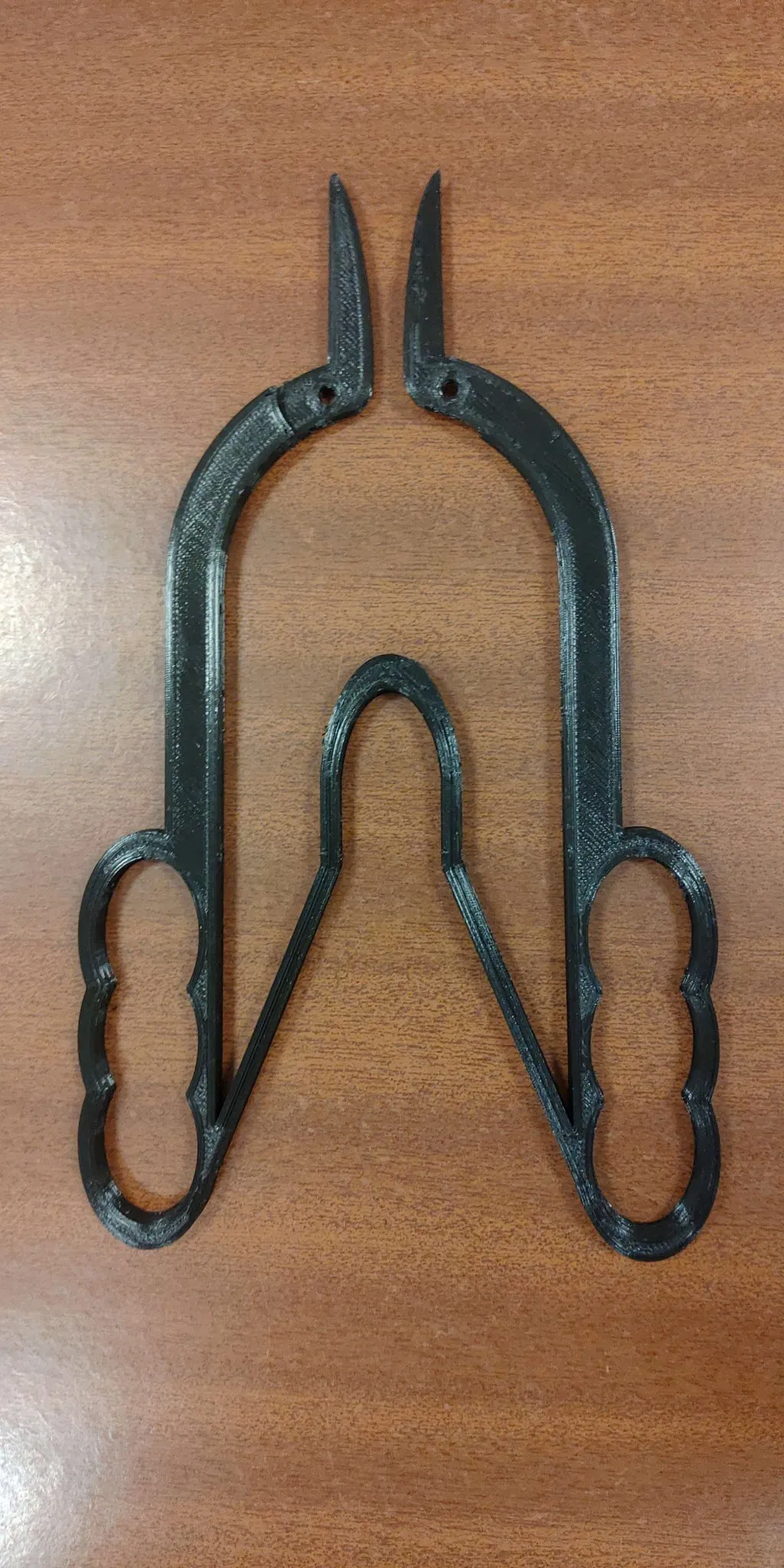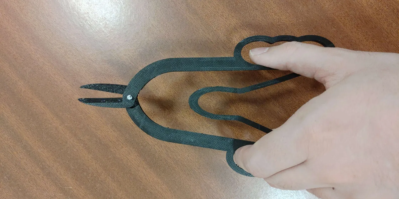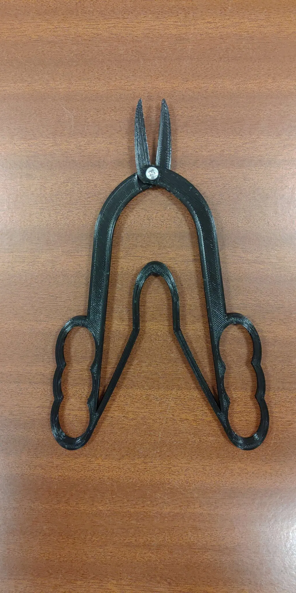 After printing you need a fulcrum for the scissors to move properly. In the photos a screw was used. The polyholes.scad library was used to make a perfectly sized hole for the screw.