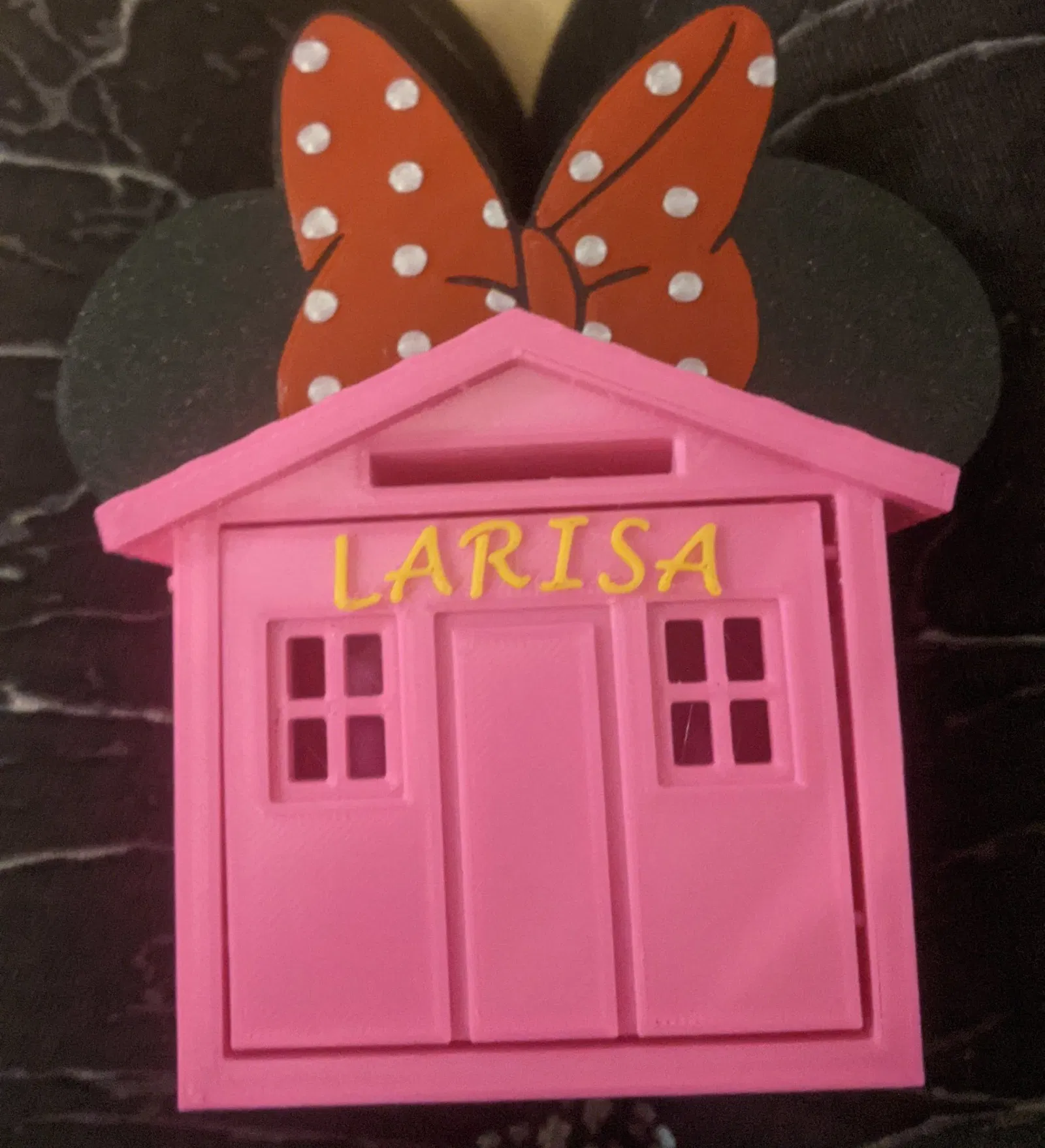 Tạo heo đất hình ngôi nhà độc đáo, có thể thêm tai chuột Minnie để trang trí. Mặt trước được cố định bằng sợi nhựa in, không cần support. Mẫu sạch, phù hợp để cất giữ kho báu của bạn.