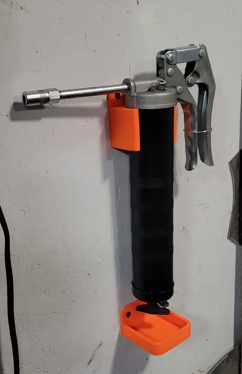 Giá treo tường đơn giản cho súng bơm mỡ thủ công, thiết kế cho đường kính ngoài khoảng 58mm. Có thêm khay hứng dầu và kẹp ống tùy chọn. Chất liệu PLA, in ngon lành với tốc độ 50mm/s.