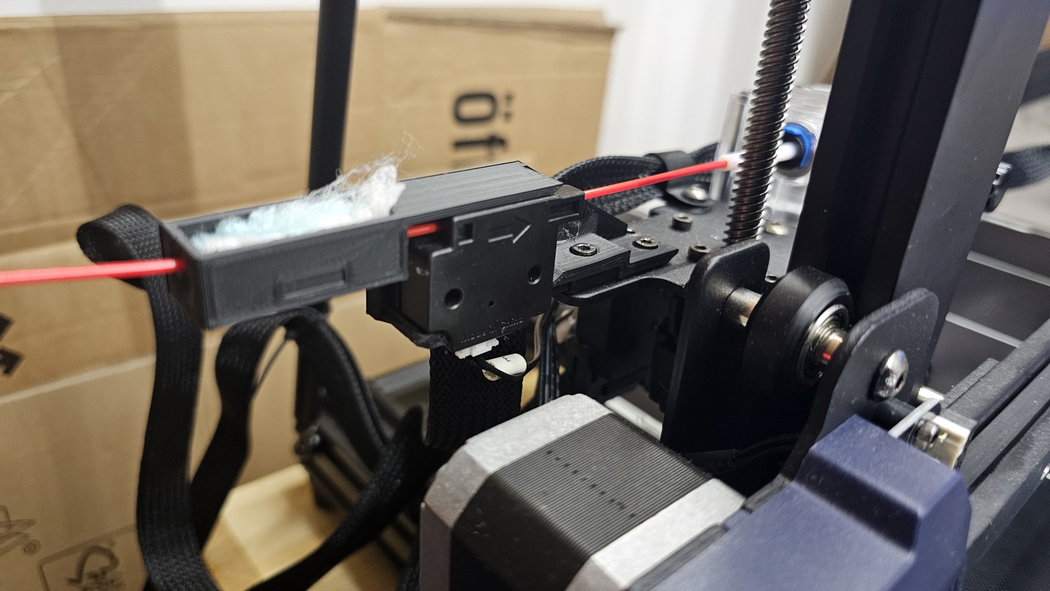 I wanted a filament duster and found the Box by SmashD. I wasn't happy with the box dangling around on the filament, so i looked some more but couldn't find one for mounting on the Kobra Max. But then i found the Sensor Guide by MY.