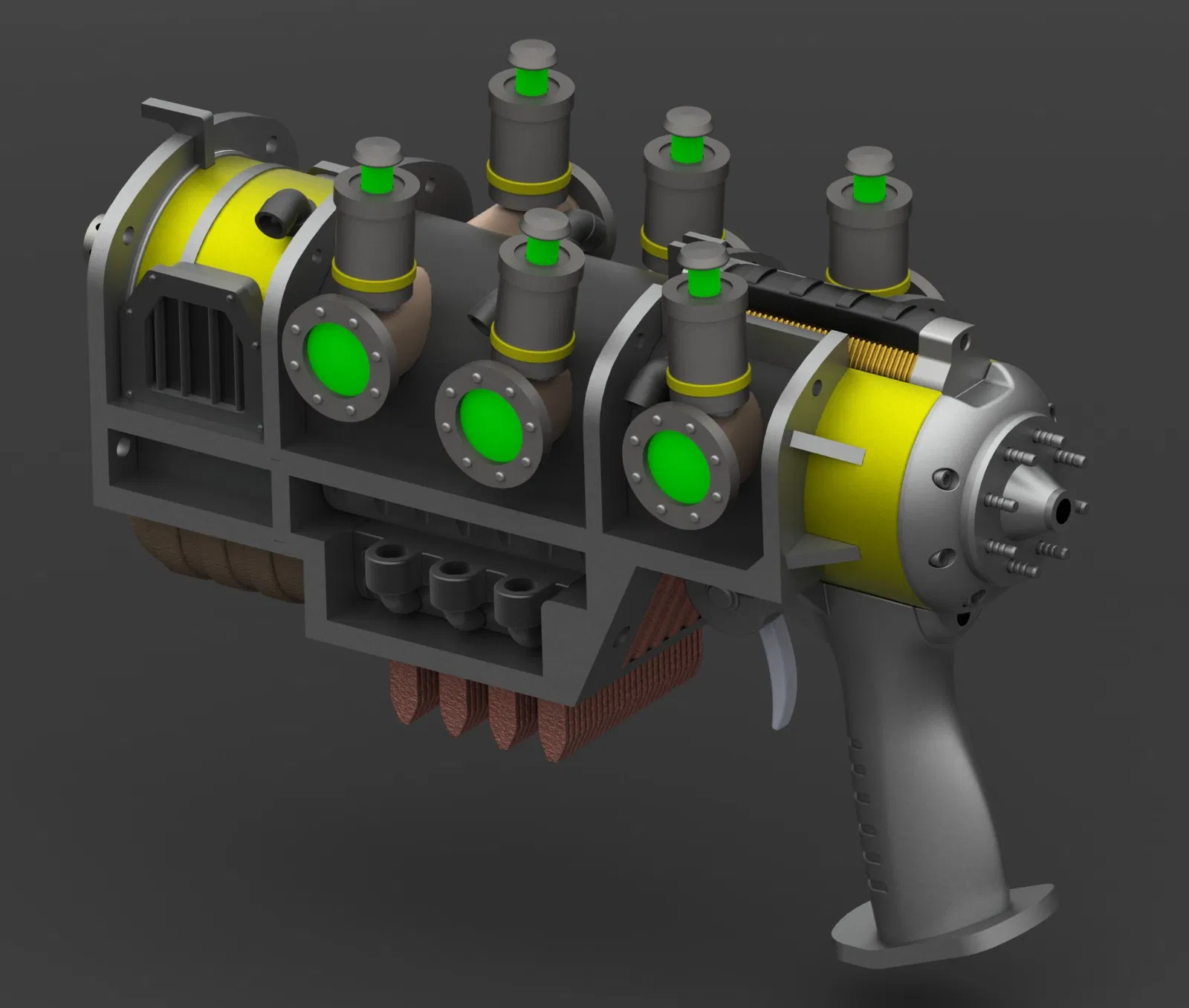 Khẩu súng Plasma Pistol từ Fallout 4, một mô hình STL với khoảng 75 bộ phận để dễ dàng in ấn, sơn và lắp ráp. Các bộ phận mod có thể hoán đổi cho nhau. Được tạo bởi lilykill.