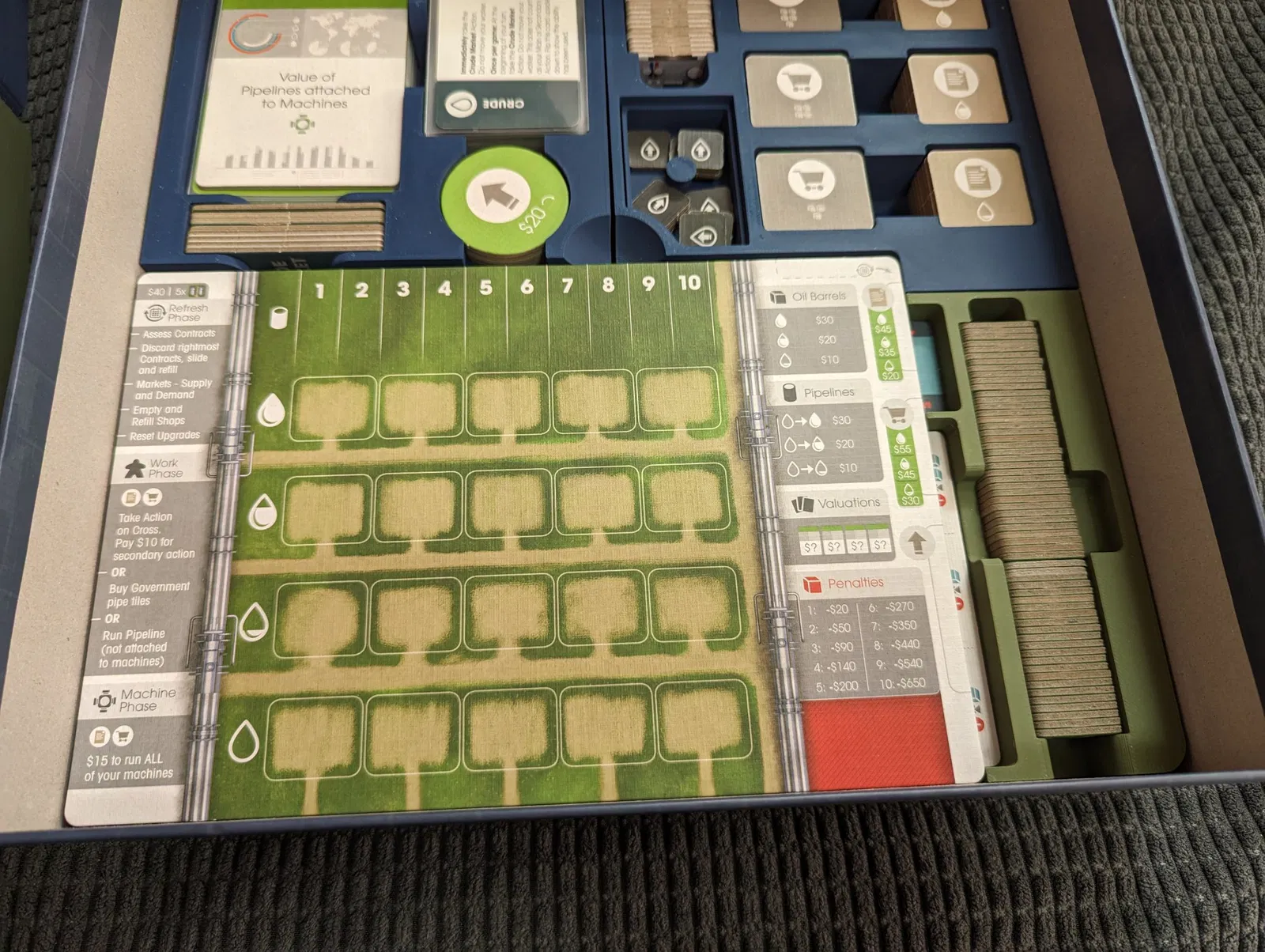 Tui đã làm lại organizer Pipeline của @Josh3d để hỗ trợ bản mở rộng Emerging Markets và thẻ có bọc. Các khay thẻ được làm sâu, rộng và cao hơn, khe gạch hành động được gấp đôi, thêm khay đựng thẻ chuyên môn mới và khay đựng gạch phủ của bản mở rộng.