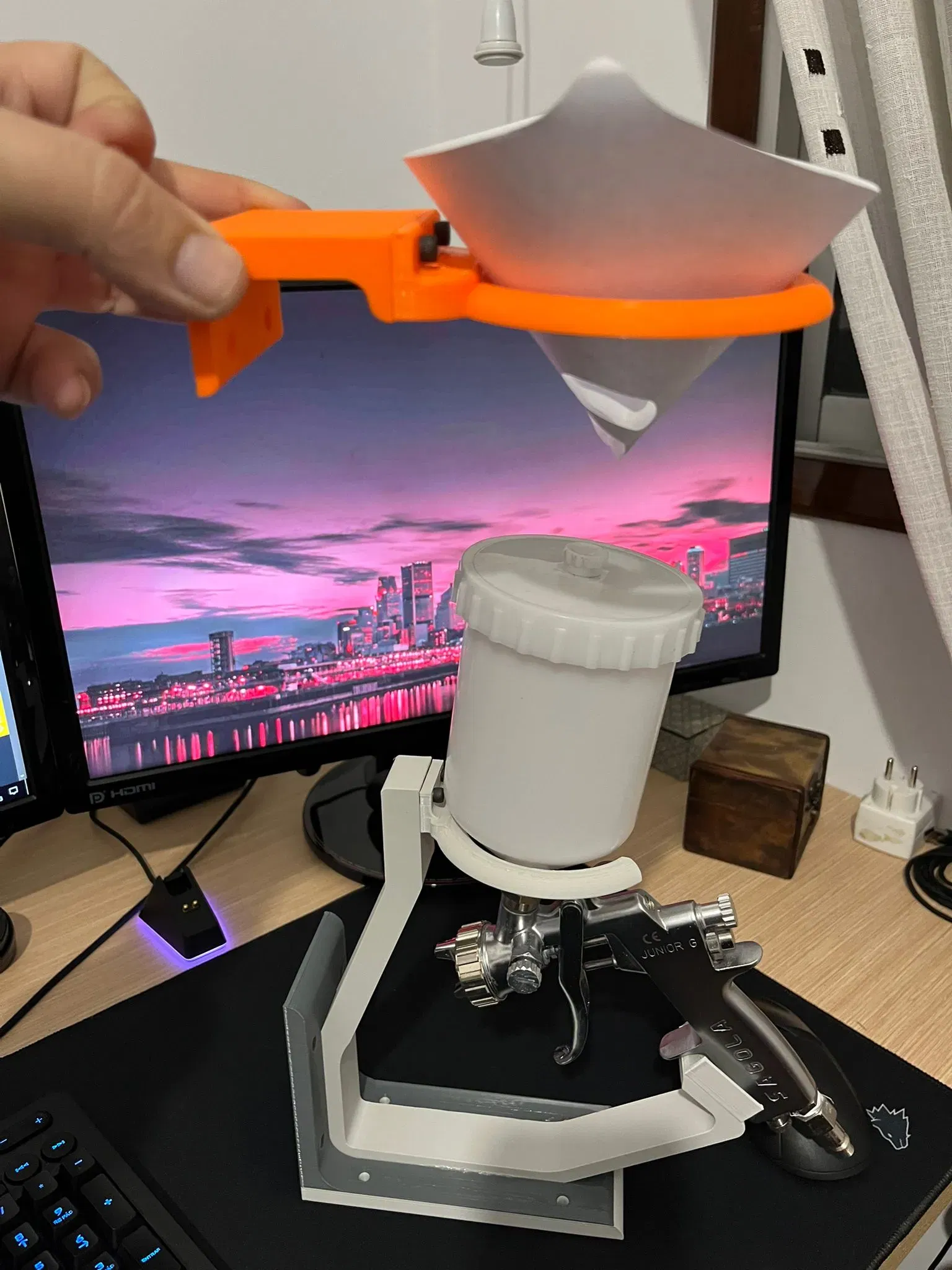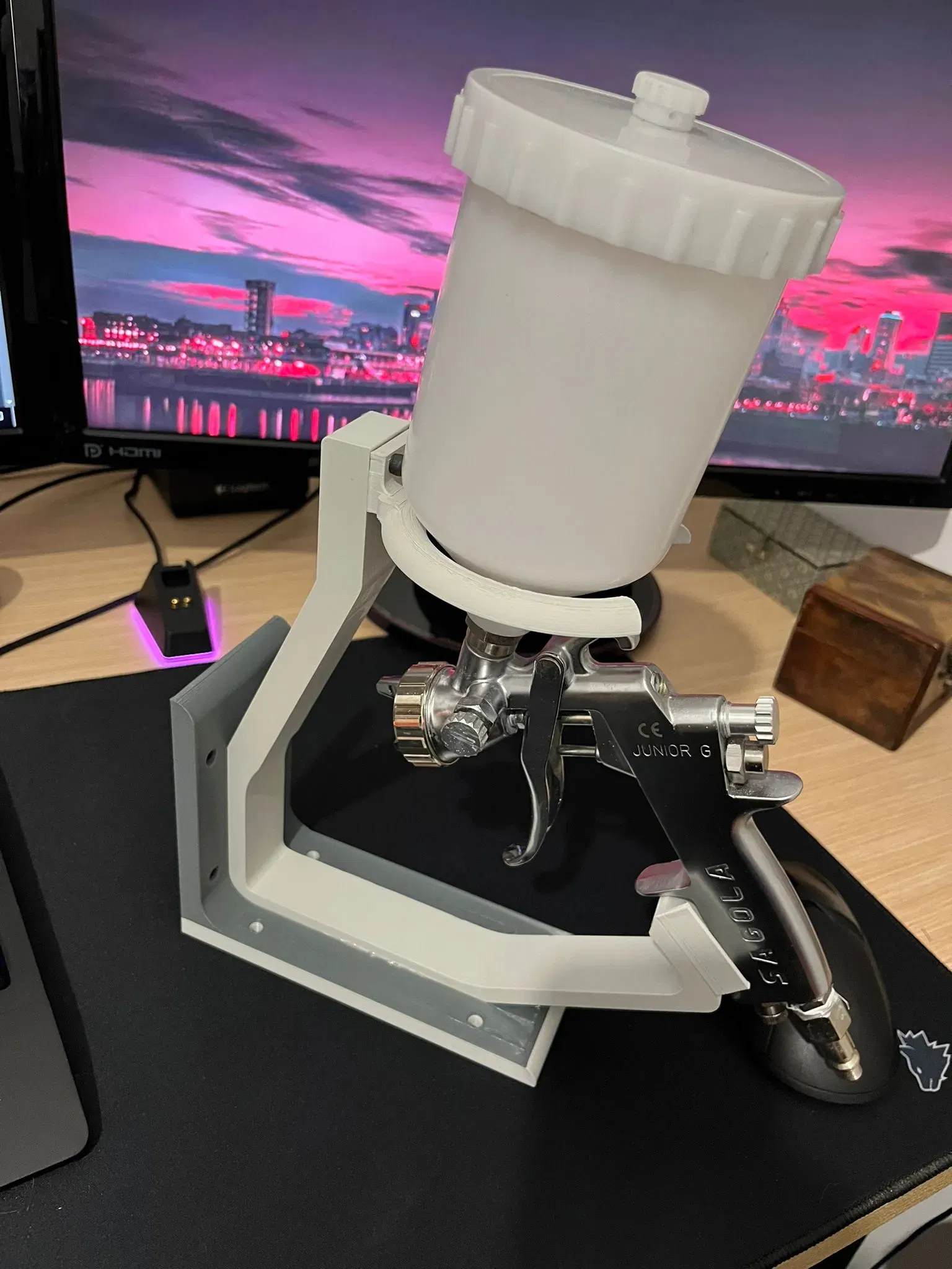 Cái này là giá đỡ súng phun sơn, có thêm chỗ để lọc sơn nữa nha. Treo tường gọn gàng lắm, xài đồ xịn rồi thì để đây cho nó đẹp.