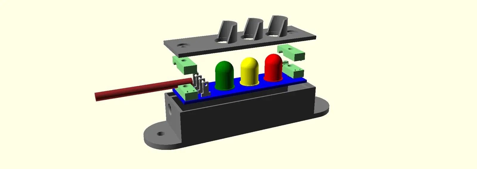 Mô hình đèn giao thông cỡ lớn, thiết kế để lắp 3 bóng LED 10mm và có sẵn chỗ để luồn dây cáp. Hoàn hảo cho các dự án điện tử hoặc trang trí mang chủ đề giao thông.
