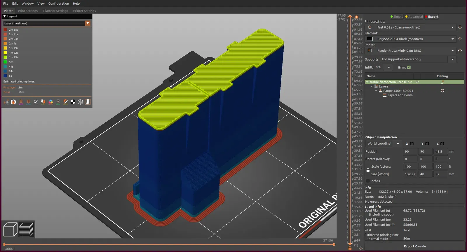 - In cái bin với 0 lớp đáy và 0 lớp ruột, nhưng có ít nhất 3.5mm lớp trên cùng để hỗ trợ và làm cứng phần móc treo. Tổng độ dày của tất cả các đường viền nên nằm trong khoảng 1.1 đến 1.4 mm. Tôi đề xuất dùng brim để lớp đầu tiên bám dính tốt.