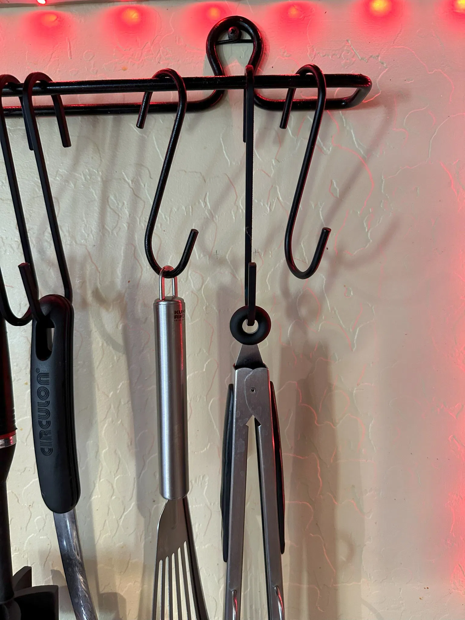 This is a super simple S Hook that you can hang kitchen utensils from using a metal cross bar. Commercial storage like this often doesn't come with enough hooks. This hook supplemented what I already had, enabling me to stop double hanging turners, spoons, spatula, etc. and hang them all singly. It's about 150mm top to bottom.