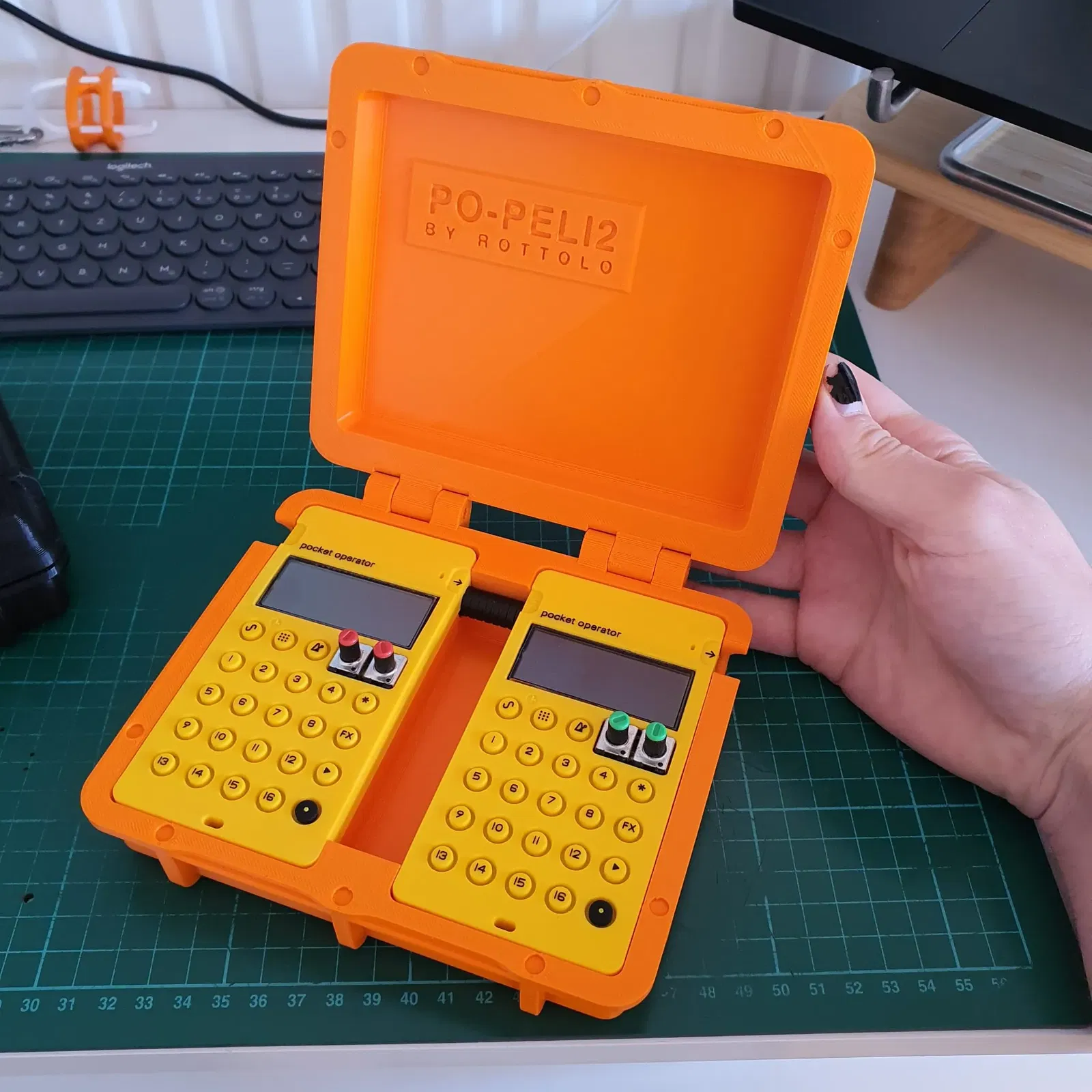 Thiết kế vỏ Pelican inspired để đựng 2 Pocket Operators cùng lúc, kèm theo vỏ silicon. Vỏ này được làm để dùng với connector AUX male-to-male và tùy chọn nam châm 5mm để đóng mở chắc chắn. Thoải mái chỉnh sửa để chứa thêm nhiều thiết bị hơn!
