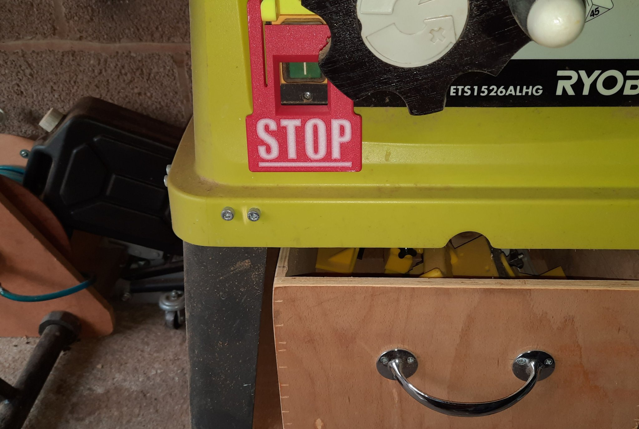 When I made my original emergency stop flap in 2018 (https://www.printables.com/model/594497-circular-saw-emergency-stop-embiggener), I had a single-colour printer (Ender 3), and was a complete novice in 3D print design. So, although the stop flap did the job, it was pretty austere and basic.