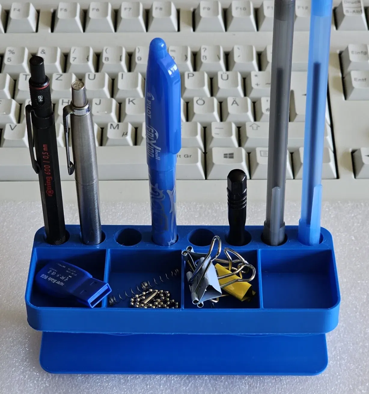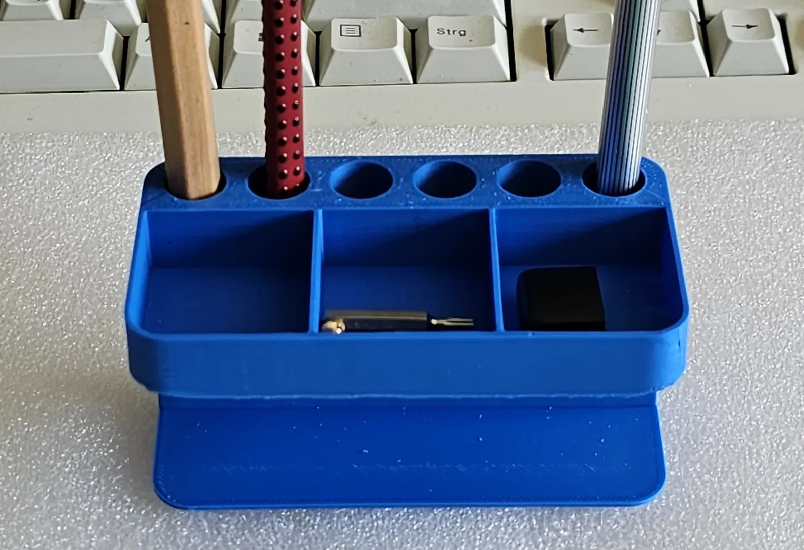 Tôi luôn gặp vấn đề về việc để những cây bút mà tôi thường sử dụng - một giá đỡ bút thì quá cồng kềnh nên chúng nằm quanh bàn phím trên bàn làm việc của tôi. Bây giờ tôi đã thiết kế một giá đỡ cho những cây bút đó và tất cả những đồ vật nhỏ khác nằm xung quanh.