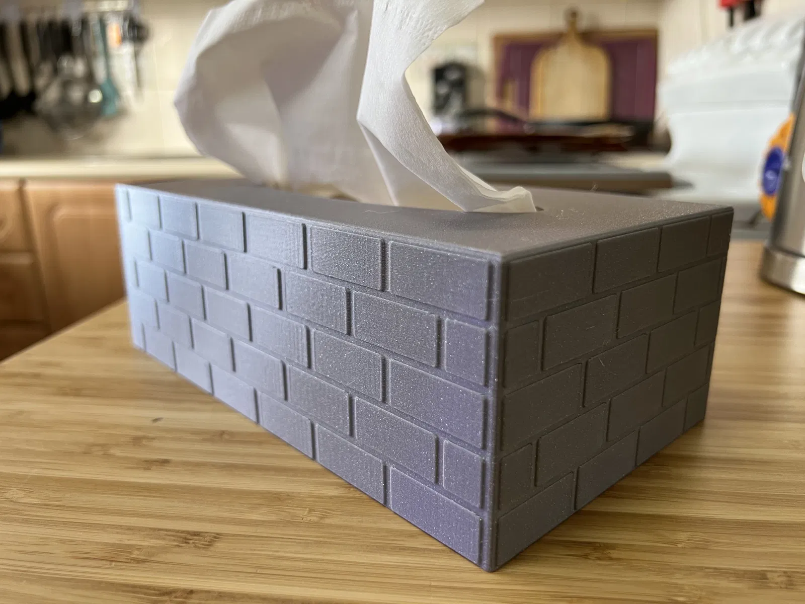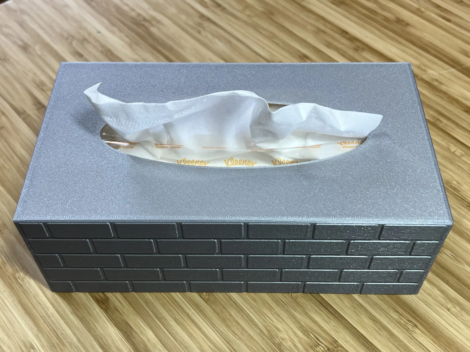 Hộp đựng khăn giấy với họa tiết giả gạch độc đáo. Kích thước bên trong 216mm x 118mm x 75mm, có thể tùy chỉnh kích thước trong slicer. Không cần hỗ trợ khi in.