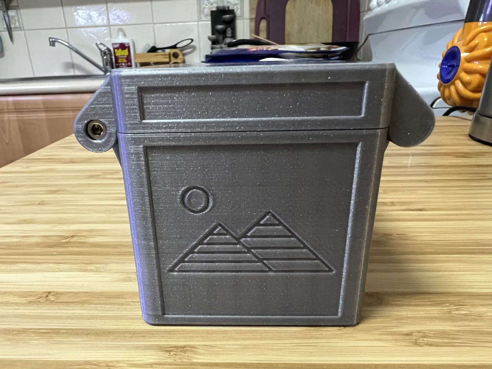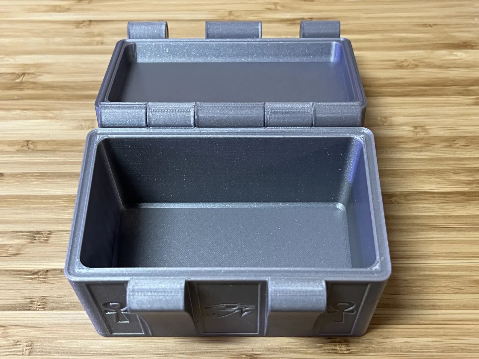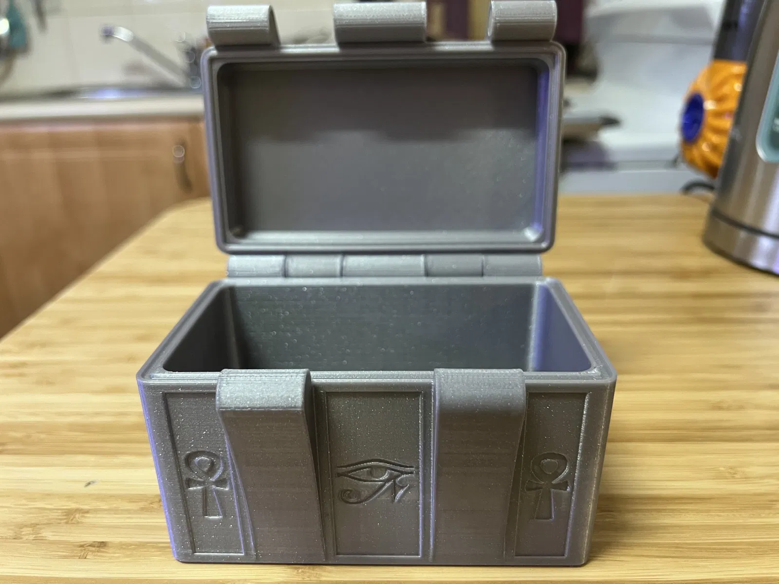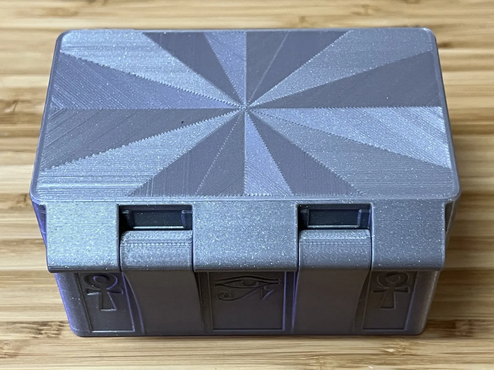 Mô hình hộp chữ tượng hình Ai Cập độc đáo với kích thước bên trong R110mm x D60mm x C55mm và bên ngoài R120mm x D95mm x C75mm. Sử dụng bản lề M3 và nam châm Neodymium 8mmx3mm. Họa tiết xoắn ốc bát giác. Không cần vật liệu hỗ trợ.