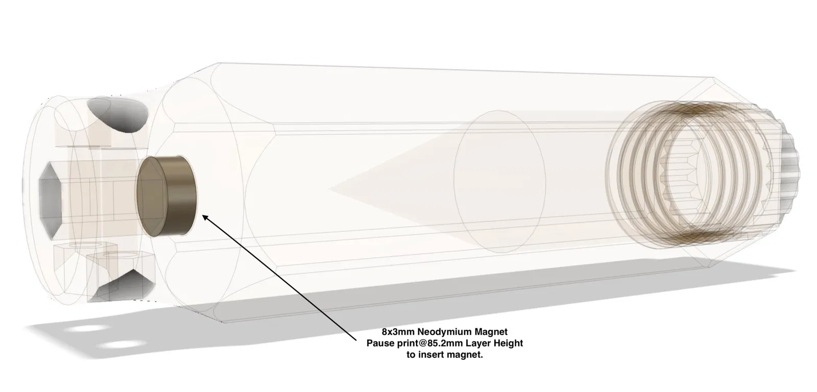 You will need 2 M3x14mm fasteners and 2 M3 nylock locknuts, and 1 8x3mm neodymium magnet.