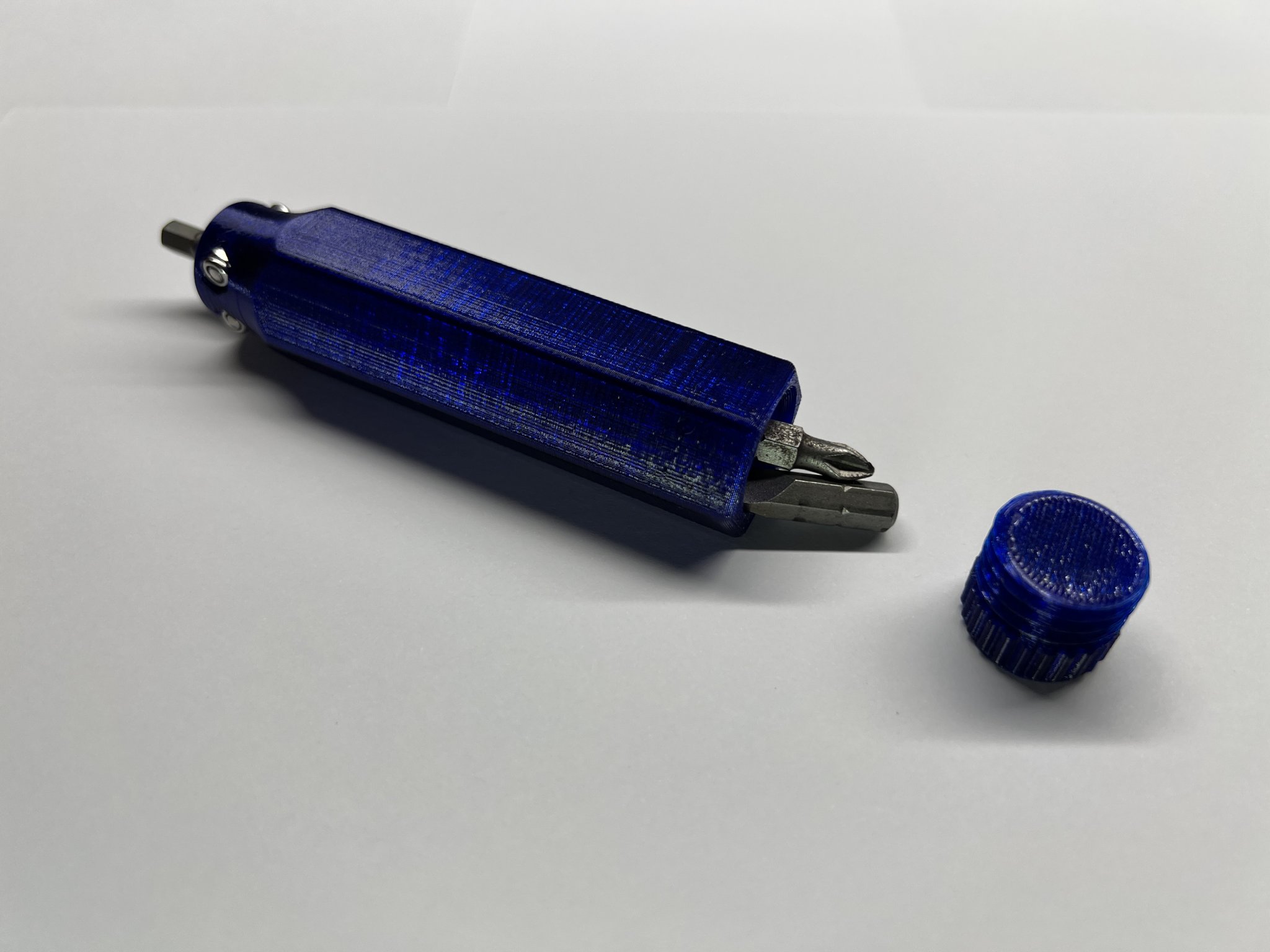 Mechanic's pocket screwdriver/bit driver. Handy if you have lots of various drive bits laying around. The handle itself is also a storage compartment for a few bits. Very handy and small enough to fit in your pocket.