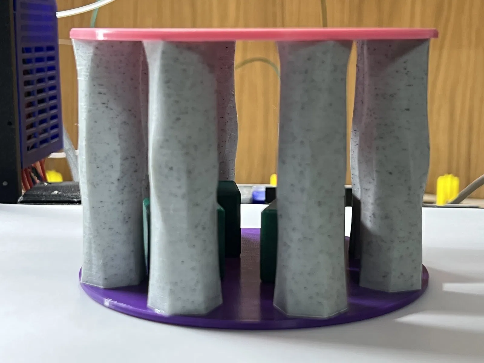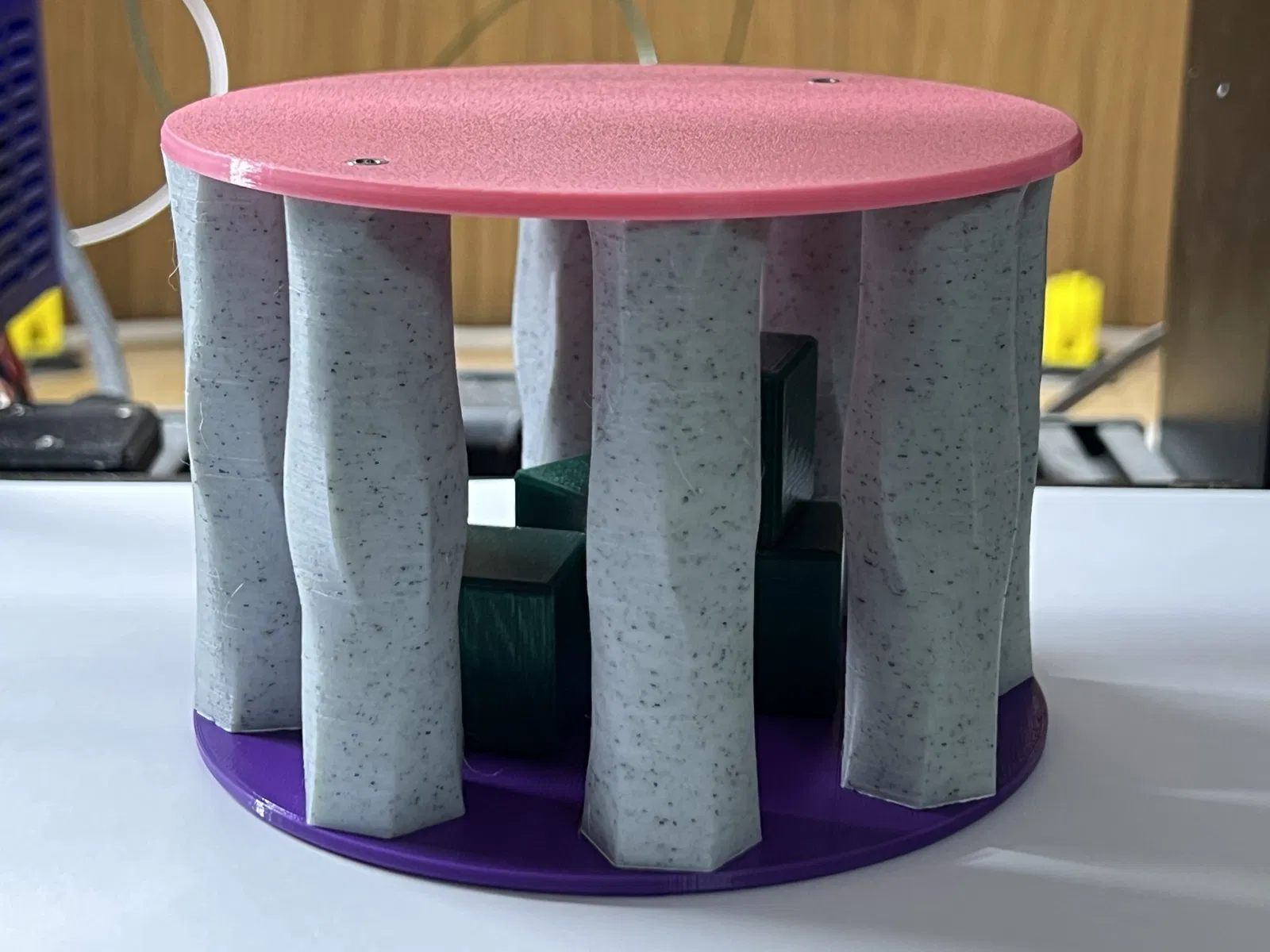 Chiếc lục lạc đồ chơi thị giác cho bé theo phong cách Stonehenge này được thiết kế để thu hút sự chú ý của trẻ. Bạn sẽ cần 2 ốc vít M3x20mm để lắp ráp. Có thể dán trụ vào đế và cho các khối lập phương vào trong, sau đó dán nắp hoặc vặn lại nếu muốn tháo rời. Bạn cũng có thể in các trụ màu khác nhau để tăng thêm phần hấp dẫn.