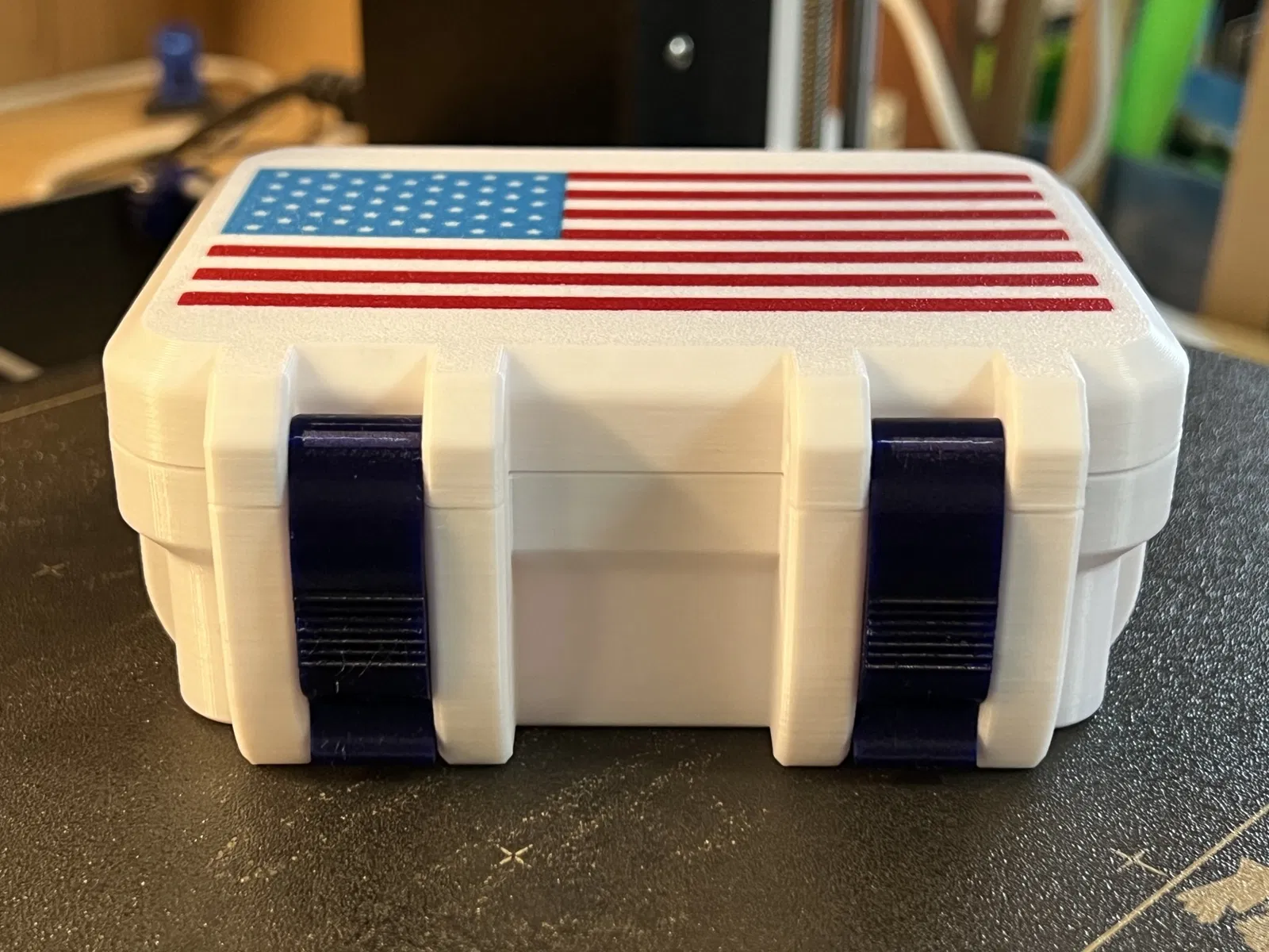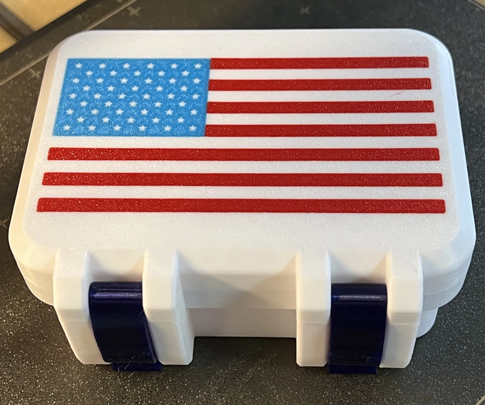 Chiếc hộp đựng đa năng hình chim cánh cụt với nắp trang trí họa tiết cờ Mỹ, thiết kế dành riêng cho MMU. Tìm kiếm phần còn lại của mẫu in tại Printables để hoàn thiện bộ sưu tập.