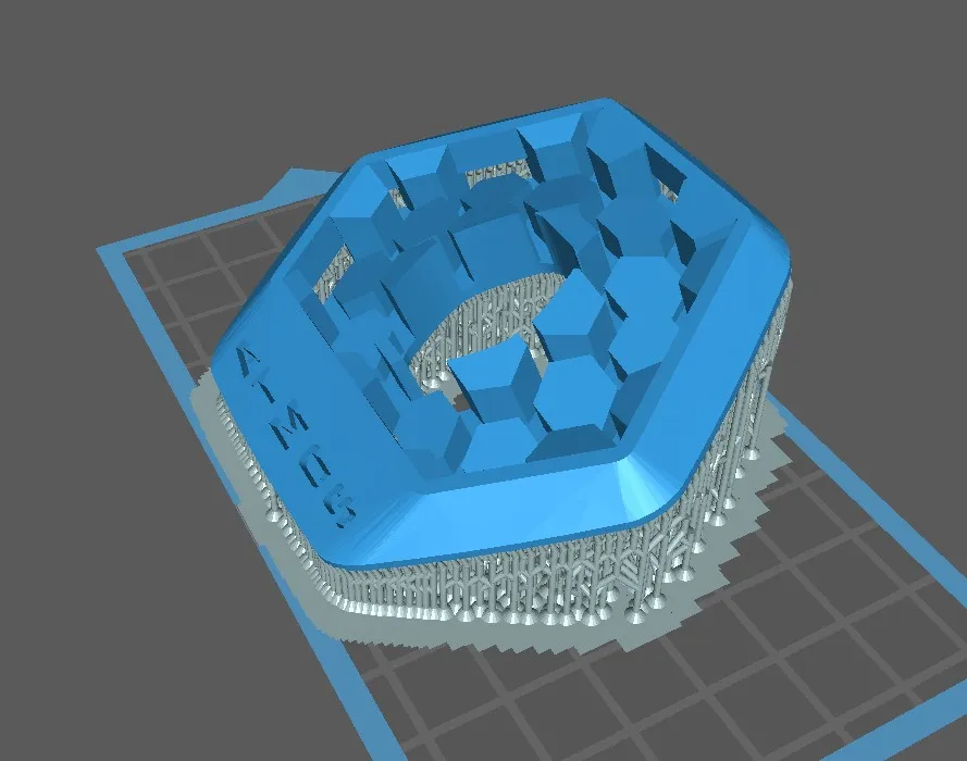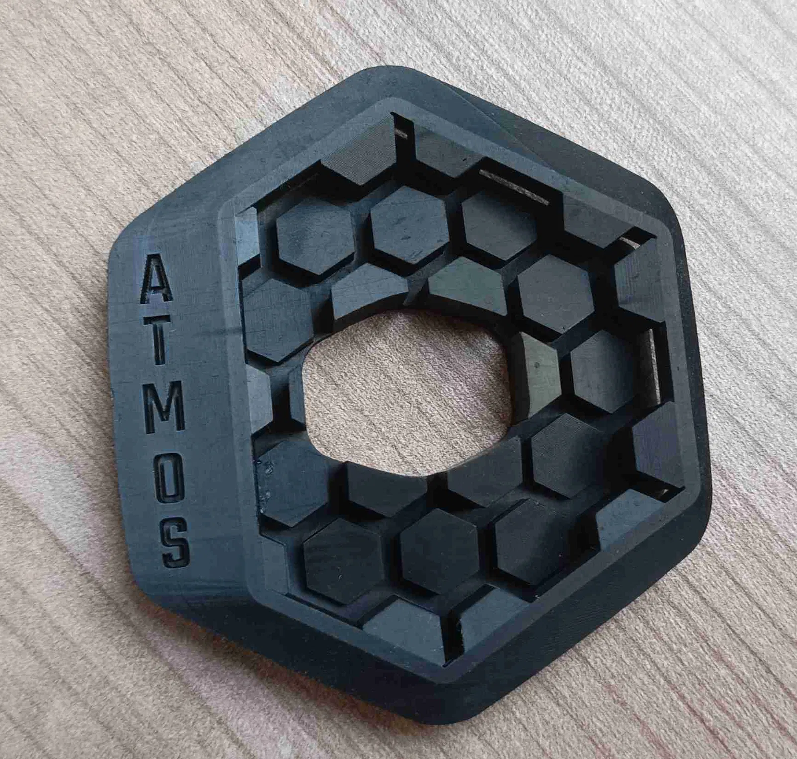 Tui đã tạo ra một nắp tản nhiệt ATMOS với thiết kế lục giác độc đáo, lấy cảm hứng từ vỏ case máy tính Cooler Master. Thiết kế này giúp khúc xạ ánh sáng hiệu quả, tạo hiệu ứng lung linh. In bằng máy SLA cho bề mặt mịn, phủ vecni tăng cường phản chiếu.
