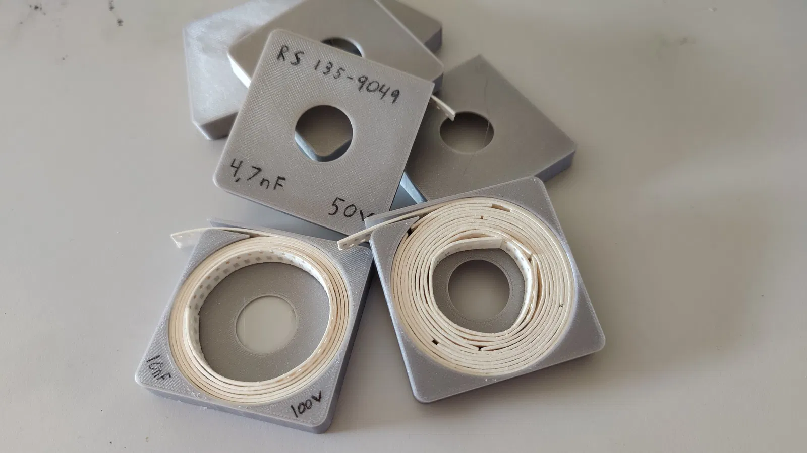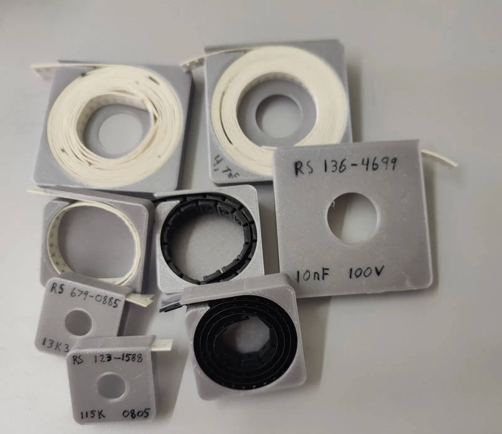 Lấy cảm hứng từ https://www.thingiverse.com/thing:2186862 nhưng tui không tìm được cái nào chứa được các cuộn SMD lớn hơn nên tui tự làm mấy cái này.
