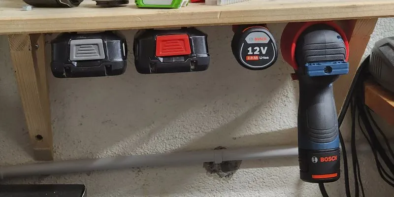 Cái đế đơn giản này được bắt vít hoặc dán bên dưới kệ và dùng để đựng pin Bosch 18V. Cái đế này tương thích với các dòng pin Bosch Green 18V.
