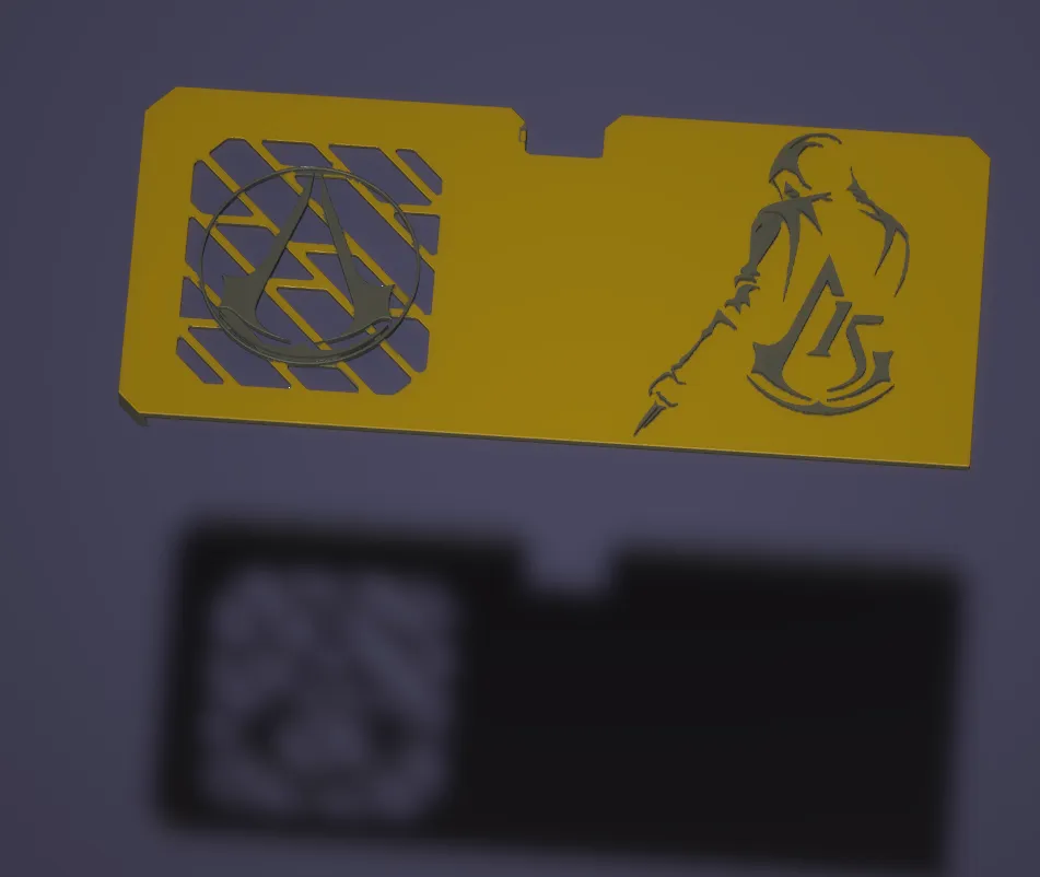Bộ khung phía trước cho VGA RTX 40xx dual Thiết kế Assassin's Creed với hình Ezio và Logo 15 năm AC Câu "Nothing is true, everything is permitted" ở trên Và hình lưỡi dao ẩn nổi ở bên hông nha
